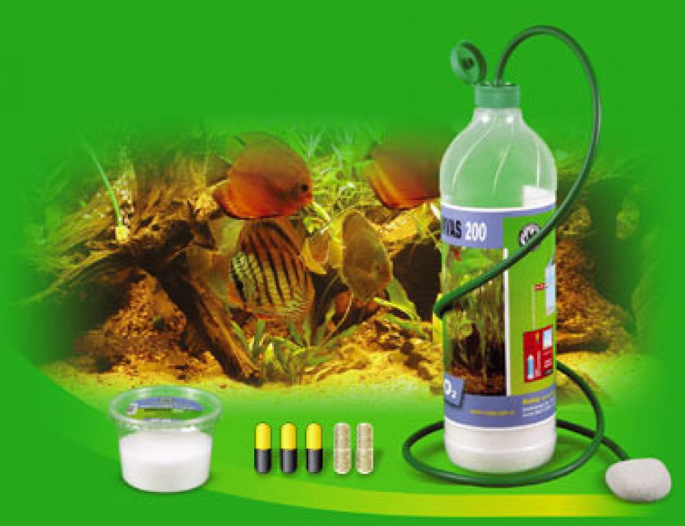 Plastovou láhev, která již obsahuje živnou sůl, naplníme po rysku vlažnou VODOVODNÍ vodou a přidáme 2 červené kapsle s mikroorganizmy. Dávku aktivátoru stanovíme orientačně následujícím způsobem: Na uzávěr nasadíme hadičku a naplněnou láhev dobře utáhneme. Láhev potom umístíme tak, aby byla nad hladinou vody v akváriu a při teplotě asi 22-25 stupňů. Menší teplota by zpomalila nebo zastavila biologický proces, naopak při větší teplotě by kvašení bylo natolik intenzivní, že by se během několika dnů spotřebovala zásoba živné soli. Těmto podmínkám nejlépe vyhovuje umístění na krycím skle v blízkosti světel. Jejich provoz zajišťuje přes den optimální teplotu. V noci, kdy se nesvítí se sníží teplota a to zpomalí žádoucím způsobem i produkci CO2. Délku hadičky přizpůsobíme tak, aby kamének, který upevníme na její konec dosáhl až na dno akvária. Tak dosáhneme toho, že bublinky CO2 unikající z kaménku budou muset překonat maximální výšku vodního sloupce a budou se ve vodě co nejvíce rozpouštět. Tím je zařízení připraveno k činnosti. V láhvi se zatím rozbíhá biologický kvasný proces, čímž vzniká CO2. O jeho průběhu se můžeme přesvědčit pohledem přes průhlednou stěnu láhve. Nejpozději do 24 hodin by mělo dojít k přetlaku CO2 a jeho probublávání přes kamének v akváriu. Pokud k tomu nedojde zkontrolujte těsnost uzávěru lahve nebo vyměňte kamének. Intenzitu procesu je nutno zpočátku kontrolovat a vyladit. A to tak, že si změříme UT vody testem Karbon a pH vody testem Akvin. Z Tillmanovy tabulky potom zjistíme, zda je CO2 v akváriu dostatek. Pokud ne, optimalizujeme činnost filtru, jak bylo popsáno výše a přidáme 1-2 kapsle aktivátoru podle velikosti odchylky pH od doporučené hodnoty. Takto “zaběhnutý“ proces by měl probíhat 7-14 dnů. Jakmile zjistíme, že produkce CO2 výrazně ustává, je nutno obsah lahve vylít, láhev dobře vypláchnout pouze čistou vodou a kvasnou kulturu založit znovu. Náhradní náplně zakoupíte v odborném obchodě.