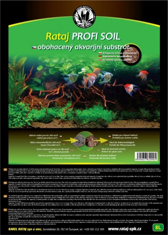 Jemnozrnný /1-2 mm/ jílový substrát svnitřní pórovitostí 100 % přírodního původu.Důležité: Při aplikaci substrátu je nutné postupovat podle návodu. To znamená přeprat ho vkýblu, nechat zaplaven minimálně 24 hodin. Po té zcedit a aplikovat do akvária. Substrát má vnitřní porovitost. Zpočátku je lehký a hůře se do něj sázejí rostliny. Proto je důležité, aby substrátu byla dostatečná vrstva. Pro sázení používejte zásadně pinzetu, nejlépe se zahnutou špičkou. Potom rostliny nevyplavávají. Na rozdíl od substrátu AquaClay u kterého trvá řadu týdnu než granule ztěžknou, je tento proces u ProfiSoilu podstatně rychlejší – 10-14 dnů. Granule jsou totiž menší a podstatně rychleji se znich dostane přebytečný vzduch.