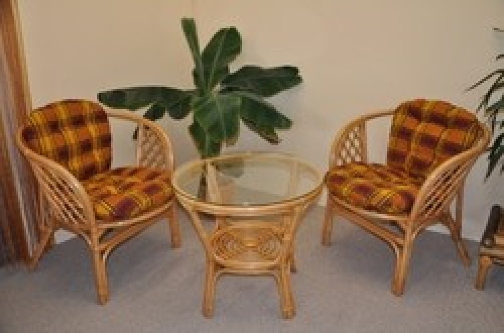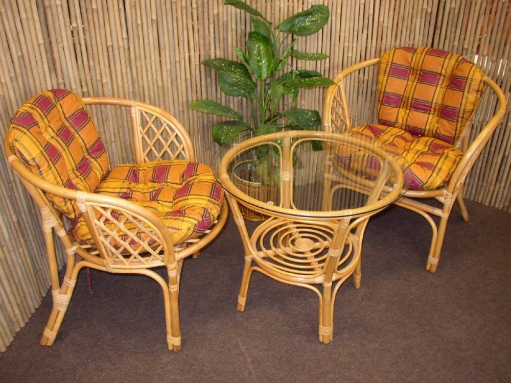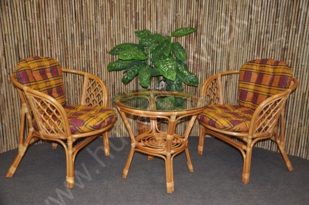 Sedací souprava Bahama patří stále mezi nejoblíbenější ratanové sedací soupravy. Souprava se skládá ze dvou křesel, stolku se skleněnou dekou a kompletní sady polstrů. | Barva ratanové konstrukce je medová.