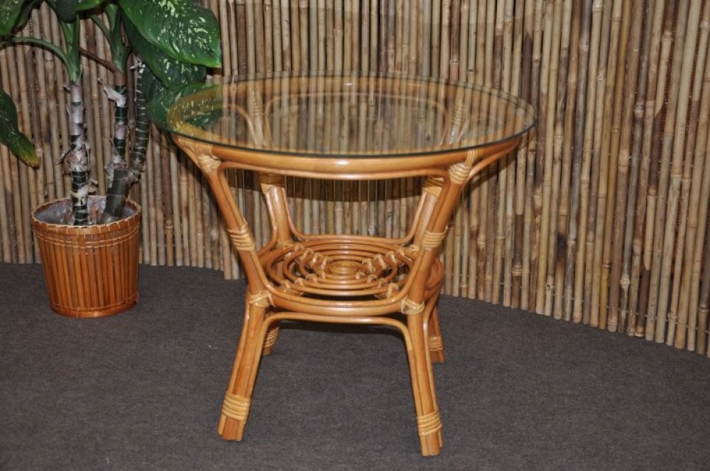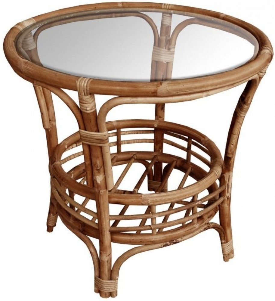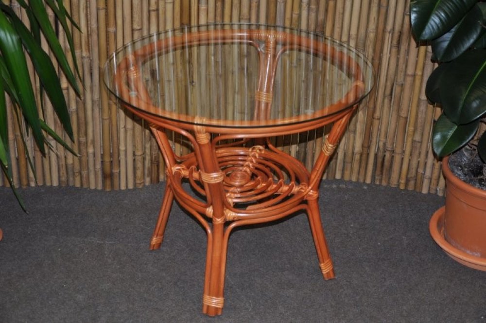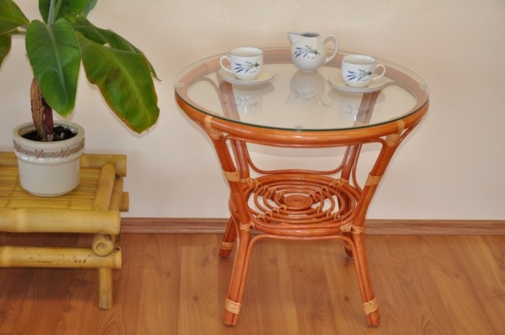 Stolek je vyrobený z přírodního ratanu se skleněnou deskou. Sklo je posazeno na plastové přísavky vsazené do konstrukce stolku a tím je ke stolku fixováno.