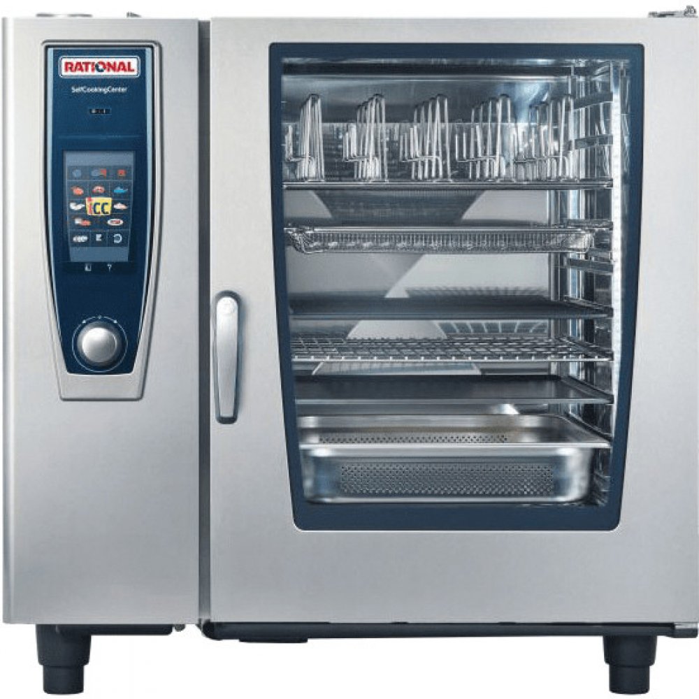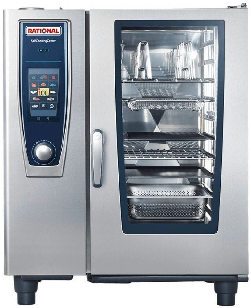 Konvektomat Rational SelfCookingCenter - popis: přívod: R3/4" odpad vody: DN 50 tlak vody: 150–600 kPa nebo 0,15–0,6 Mpa jištění: 3 x 63 A síťová přípojka: 400 V, 3 fáze, střídavé kapacita:10 x 2/1 GN osvětlení LED dvířka varné komory z trojitého skla zobrazení spotřeby energie RATIONAL funkce vzdáleného přístupu vestavěná ruční sprcha s navíjecím mechanismem odstředivý systém odlučování tuků Clim...