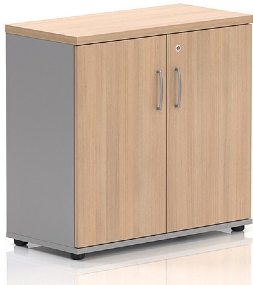 Kam se hodí? Střední skříň Visio LUX s rozměry 80 x 38,5 x 113 cm doporučujeme zejména pro pracovny zaměstnanců a nižšího managementu. Od standardní verze Visio se liší v barevném provedení, kdy Visio LUX nabízíme ve speciálních dezénech s šedými boky. Do těchto skříní můžete bez problému umístit šanony s dokumenty i drobnou techniku, kterou tak budete mít vždy po ruce. Řada Visio LUX nabízí širokou škálu prvků. Díky tomu lze nábytkovou sestavu optimálně přizpůsobit konkrétnímu prostoru. Třeba prostřednictvím kontejnerů, jednacích stolů nebo nejrůznějších doplňků. Skříně součástí sestavy Visio LUX Skříně součástí sestavy Visio LUX Přizpůsobte si vaši kancelář Střední skříň Visio LUX disponuje dvěma policemi, které při rovnoměrném zatížení unesou až 25 kg. Vrchní deska skříně má sílu 28 mm a je stejně jako ostatní desky vyrobena z laminované dřevotřísky. Skříň je vybavena nastavitelnými nožkami, díky kterým můžete změnit její výšku až o 10 mm a přizpůsobit si ji podle potřeby. Nastavitelné nožky vám také pomohou vypořádat se s nerovnostmi podlahy. Skříň dodáváme s uzamykatelnými křídlovými dveřmi po celé výšce, které disponují kovovými úchytkami. Světlý nebo tmavý dezén? Skříně Visio LUX nabízíme ve dvou dezénech, které vám zaručí jednotný vzhled vaší kanceláře. Boky a záda skříně jsou v elegantní šedé barvě. Světlý dezén, kterým je dub, navozuje příjemnou pracovní atmosféru a kancelář se díky němu zdá prostornější. Tmavý dezén, jako je ořech, naopak vyvolává pocit stability a autority. Dezény: dub, ořech