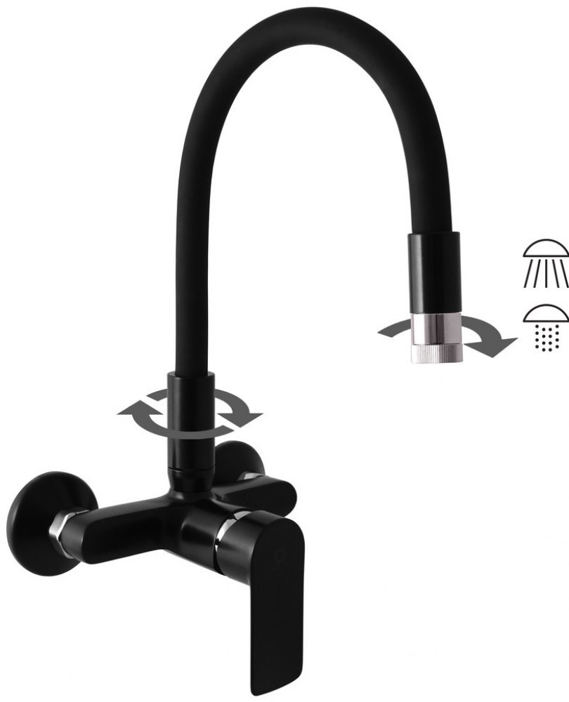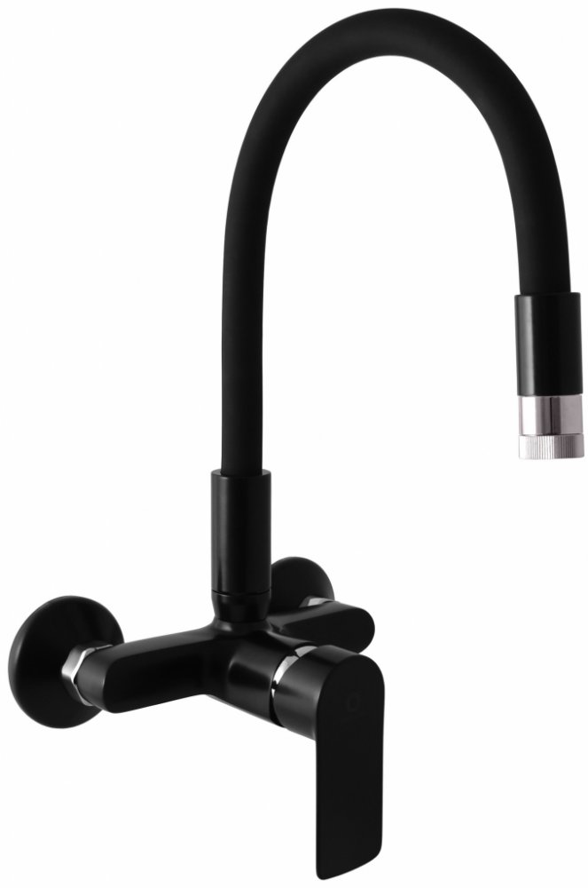 Vodovodní baterie dřezová nástěnná s flexibilním otočným ramínkem.