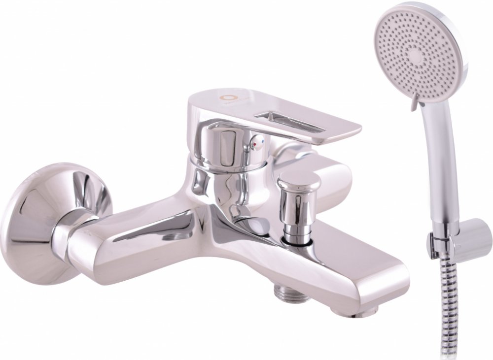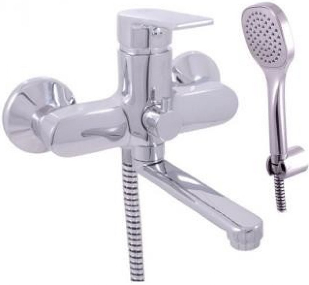 Vodovodní baterie vanová nástěnná s plochým otočným ramínkem, sprchou a pevným držákem.