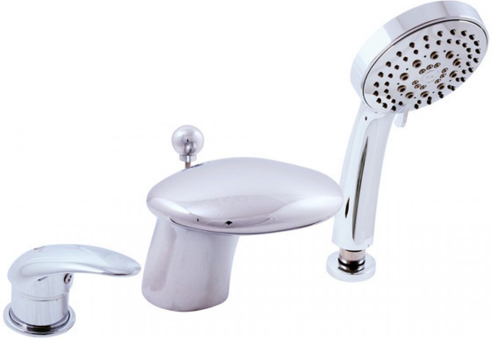 Vodovodní baterie vanová stojánková tříotvorová s přepínačem ve výtoku, samonavíjecí sprchou a 2m hadicí.