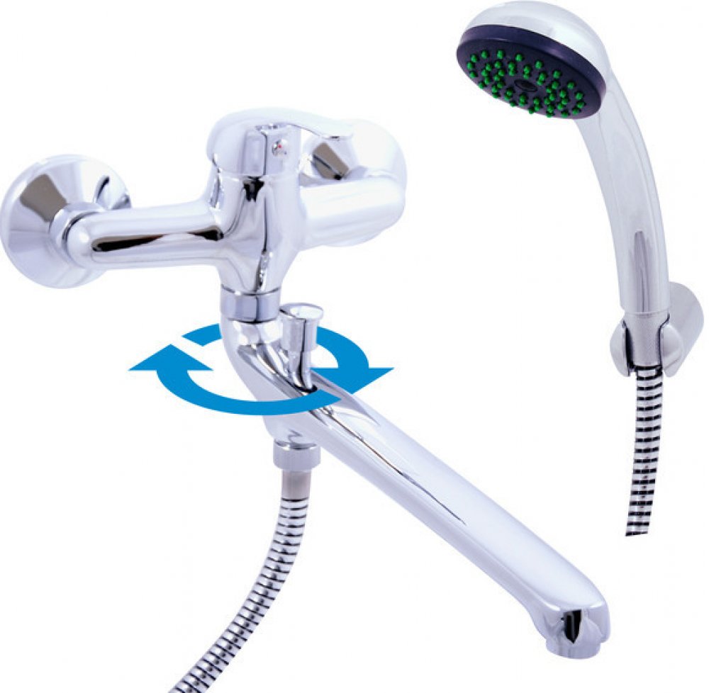 Vodovodní baterie pro vanu a umyvadlo nástěnná s plochým ramínkem, sprchou a pevným držákem.