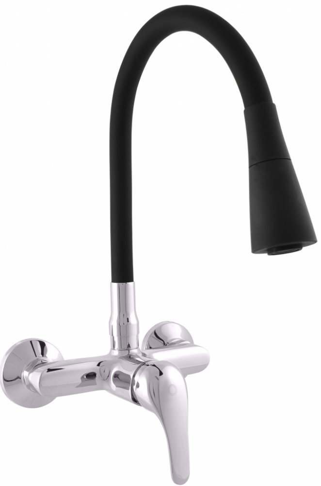 Vodovodní baterie dřezová nástěnná s flexibilním otočným ramínkem se sprchou.
