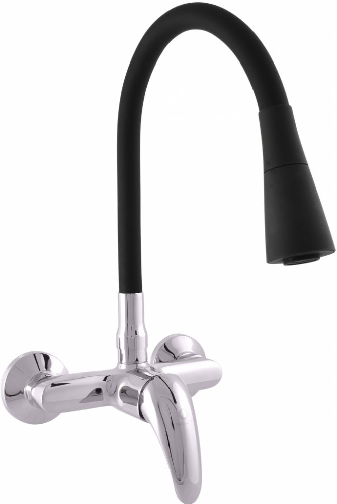 Vodovodní baterie dřezová nástěnná s flexibilním otočným ramínkem se sprchou.