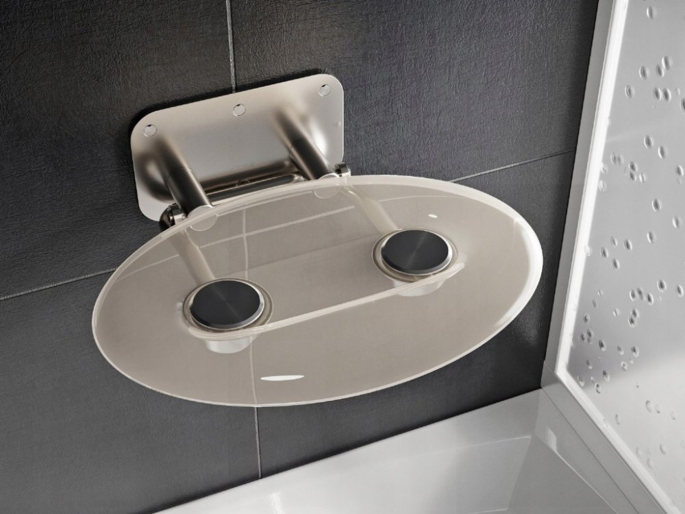 Sklopné sprchové sedátko Ovo P II. Nerezové provedení konstrukce s průhledným sedákem Clear. Oválný tvar. 10 let záruka
