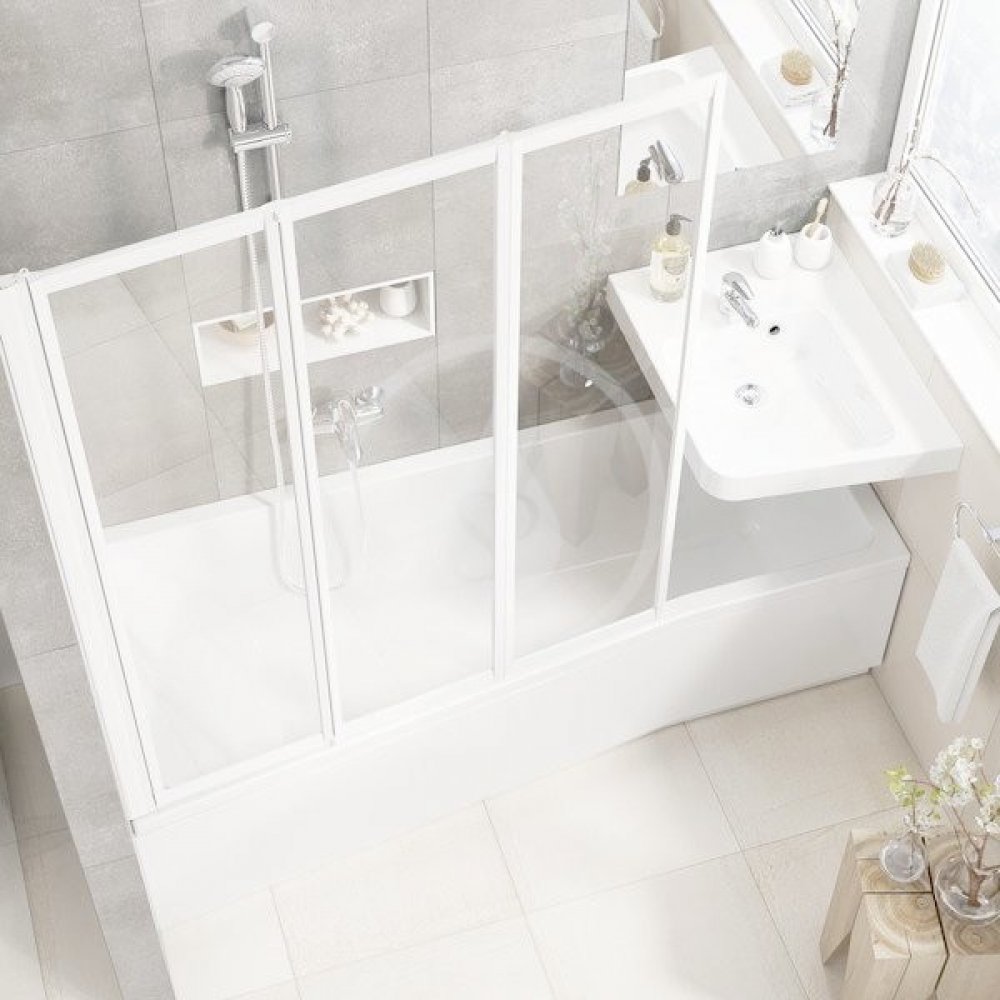 Vana tvoří celek se sprchovou zástěnou VS3, která přesně kopíruje její tvar. Tato třikrát zalomená zástěna z ní vytvoří dokonale těsnící sprchový kout. Skládá se ke zdi, takže neruší interiér a nijak nepřekáží při vstupu do vany.