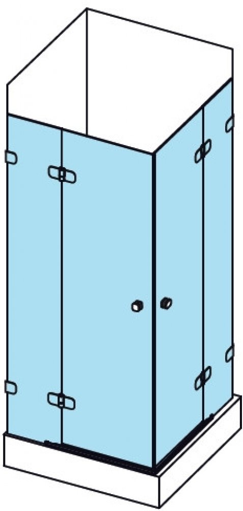 Výrobek se skládá ze dvou rovných pevných dílů (8mm) a dvou dveří (6mm), které tvoří rohový vstup. Výška výrobku je 1950 mm.