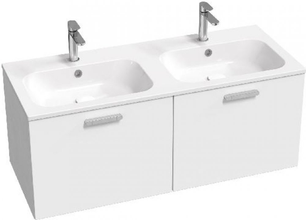Skříňka pod dvojumyvadlo Chrome II barva lesklá bílá materiál impregnovaná deska MFPB a MDF rozměry 1200 x 470 x 490 mm 2 velké zásuvky s tichým dovíráním 1x nízká integrovaná zásuvka 2x madlo 152 mm, chrom instalace zavěšením na zeď dodáváno smontované Umyvadlo a baterie nejsou součástí balení, je třeba objednat zvlášť. Fotografie jsou ilustrativní.Tento produkt Vám může být doručen bez originálního obalu. Důvodem je ochrana produktu proti poškození během přepravy k Vám.