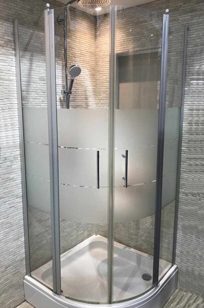 Skládá se ze dvou rovných pevných dílů a jednoho ohýbaného dílu tvořícího otočné dveře.