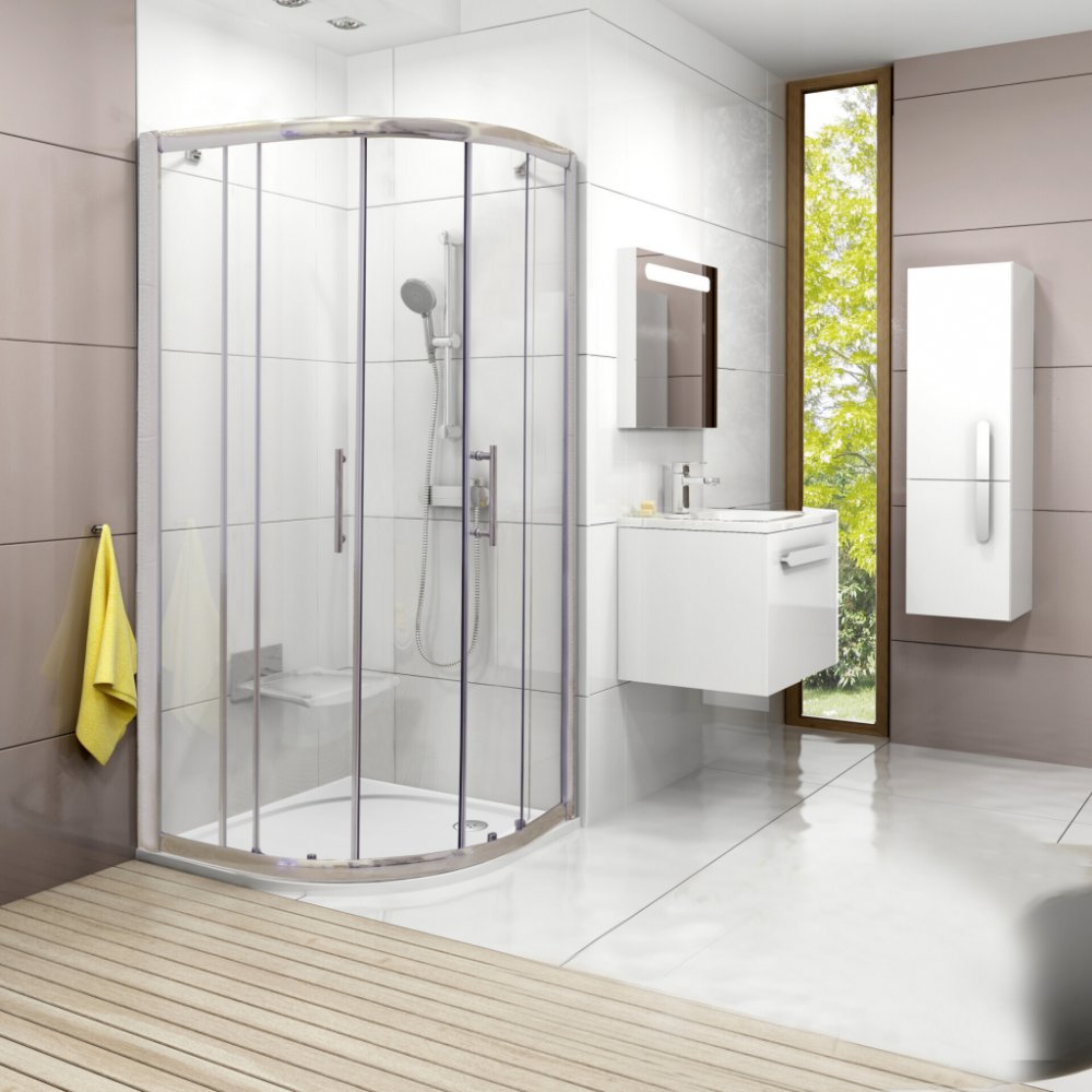 Čtyřdílný čtvrtkruhový sprchový kout v provedení lesklý chrom a s výplní z čirého skla s ochrannou vrstvou RAVAK AntiCalc®. Posuvný systém otevírání. Stabilní rámová konstrukce.