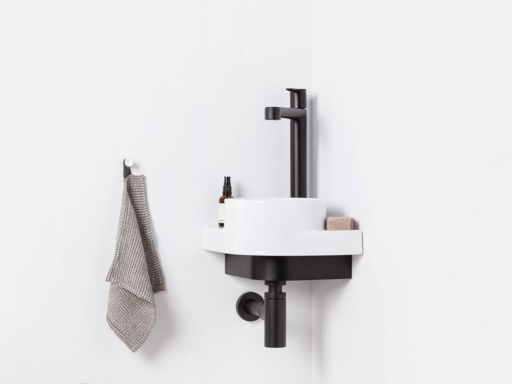Kruhové umývátko do rohu doplňuje designový prvek v podobě upevňovací konzole v bílém, černém nebo nerez provedení. Kouzlo elegance přináší sladění konzole, baterie, sifonu a pilety do jednoho tónu.