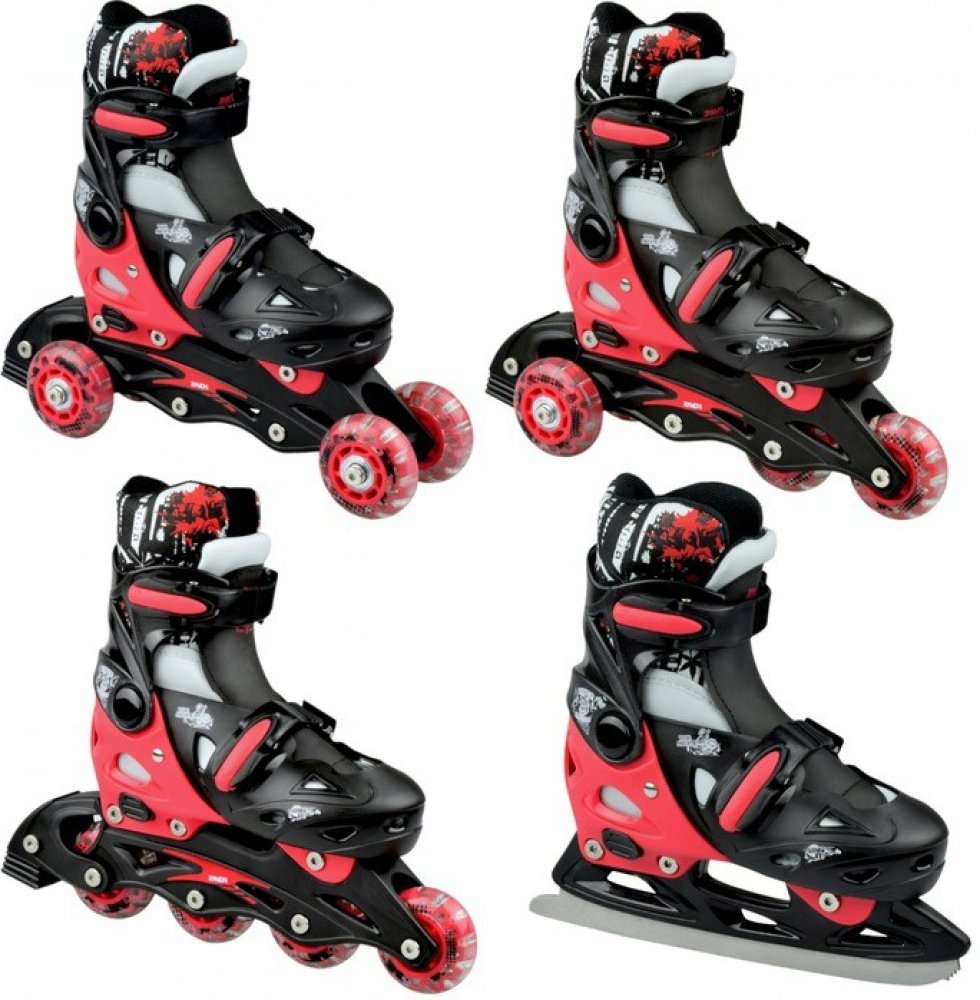 Kolečkové brusle lze jednoduše přemontovat na zobrazené varianty na obrázcích. Balení obsahuje sadu dílů pro vlastní montáž kolečkových z inline do varianty kol vedle sebe.