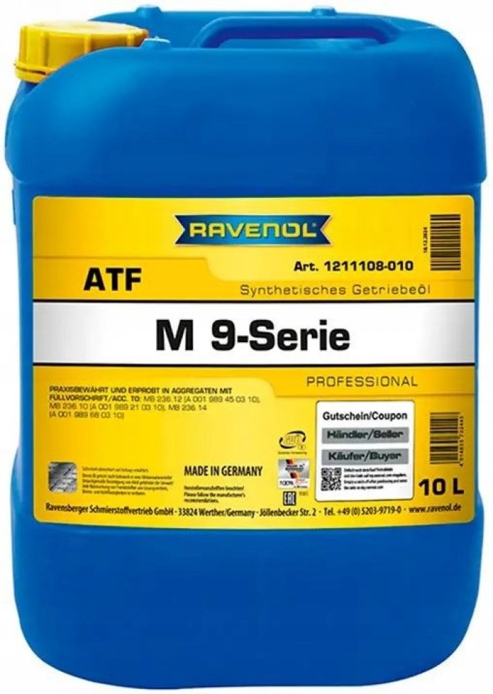 Ravenol ATF M 9-Serie, 10LJe navržen na základě hydrokrakování olejů PAO se speciálními aditivy a inhibitory k zajištění řádného fungování automatické převodovky.