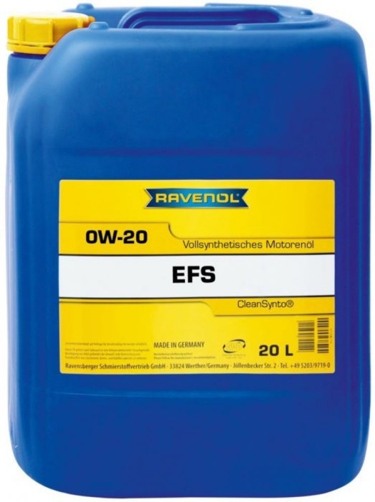 RAVENOL EFS 0W-20 je plně syntetický motorový olej s nízkým třením na bázi PAO (Polyalphaolefin), se speciální technologií USVO® a osvědčenou technologií CleanSynto® pro benzinové a dieselové motory osobních automobilů s nebo bez turbodmychadla a přímého vstřikování.