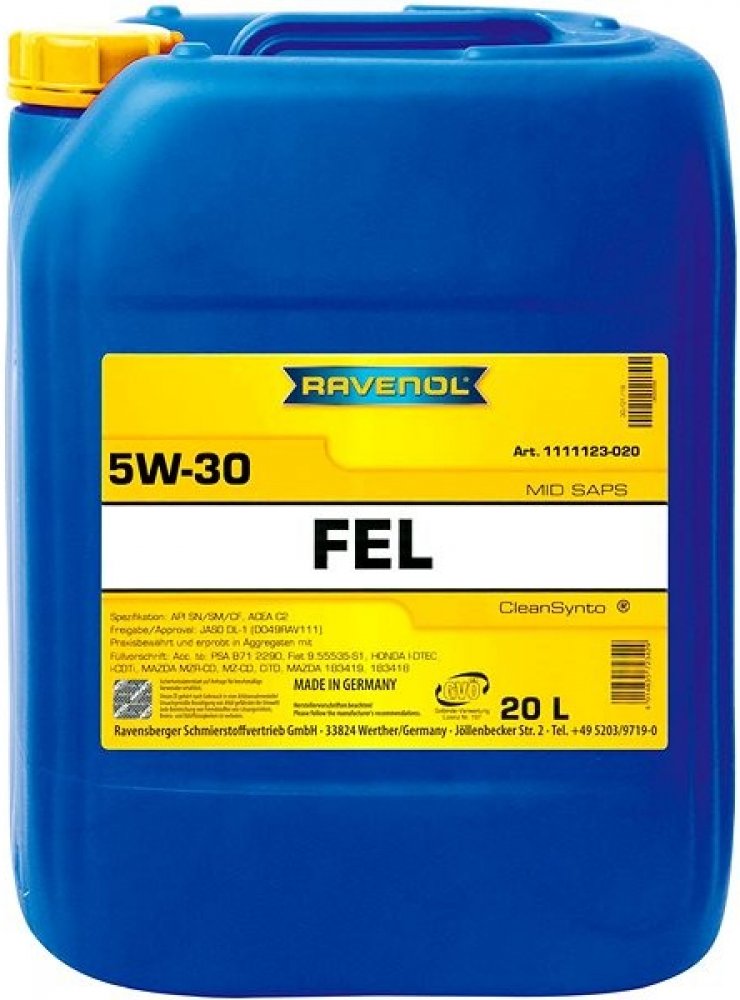RAVENOL FEL 5W-30 je plně syntetický Mid SAPS s nízkým třením motorový olej pro automobilové motory benzinové a naftové s nebo bez přeplňování turbodmychadlem a přímým vstřikováním. Minimalizuje tření, opotřebení a spotřebu paliva, výborný vlastnosti studených startech. Prodloužený interval výměny oleje v souladu s pokyny výrobce.
