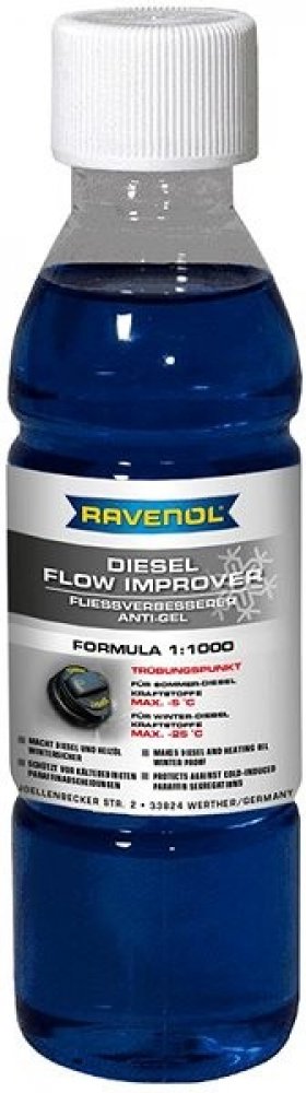 Vysoce výkonný přípravek na zlepšení konzistence a průtoku nafty v zimním období, odolný vůči teplotám až do -33 °C. Použití RAVENOLU Fließverbesserer; 250 ml (VE 24 Stück)Vhodný pro všechny dieselová paliva a motorové systémy jako je Common-Rail nebo přímé vstřikování.