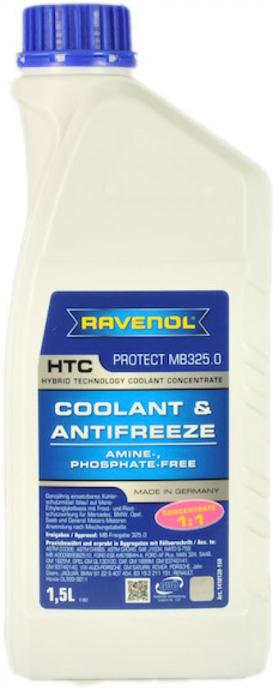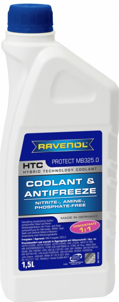 RAVENOL Antifreeze HTC je celoroční chladicí kapalina na bázi monoetylenglykolu s ochranou proti mrazu a korozi, neobsahuje aminy a fosfáty. Výrobek je formulován na bázi osvědčeného vývoje inhibitoru pomocí kombinace silikátů s organickou aditivní technologií OAT.