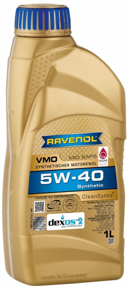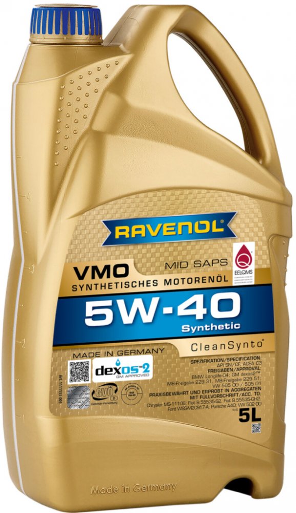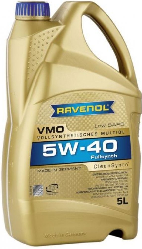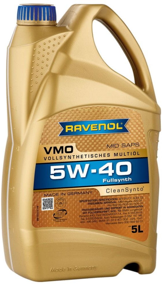RAVENOL VMO SAE 5W-40 je syntetický motorový olej s nízkým třením Mid SAPS s technologií CleanSynto® pro benzinové a naftové motory osobních automobilů s přeplňováním a bez přeplňování a přímým vstřikováním.