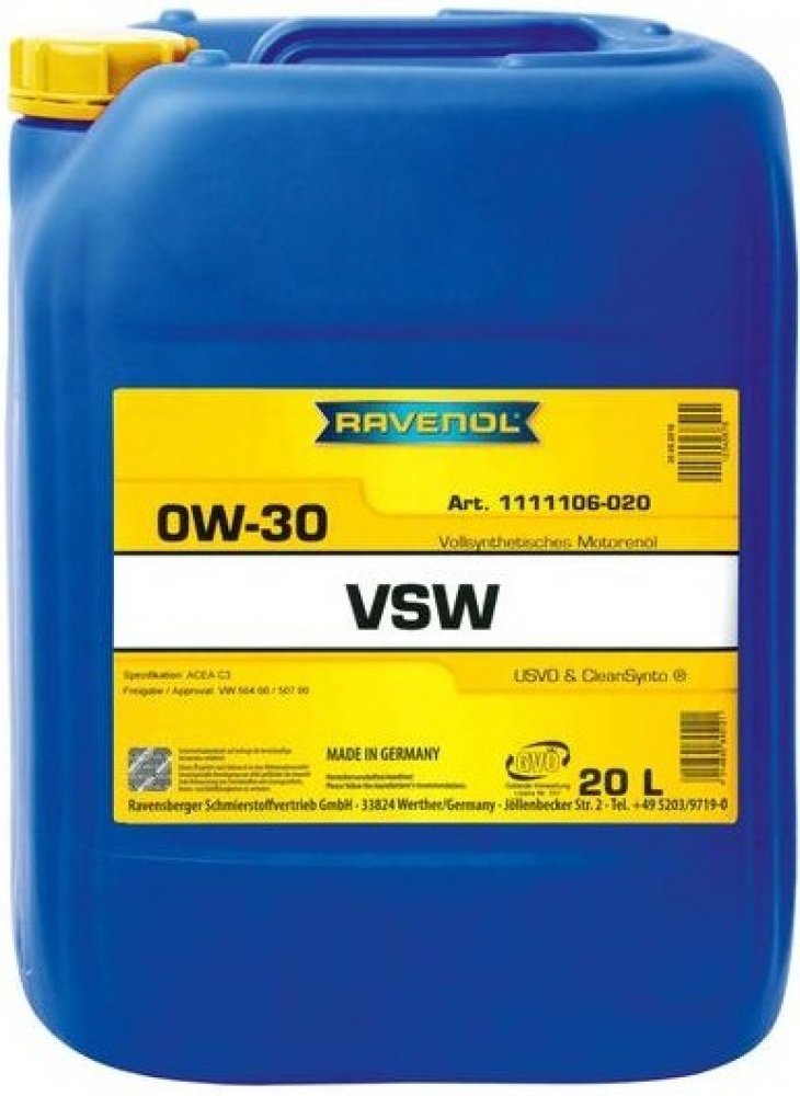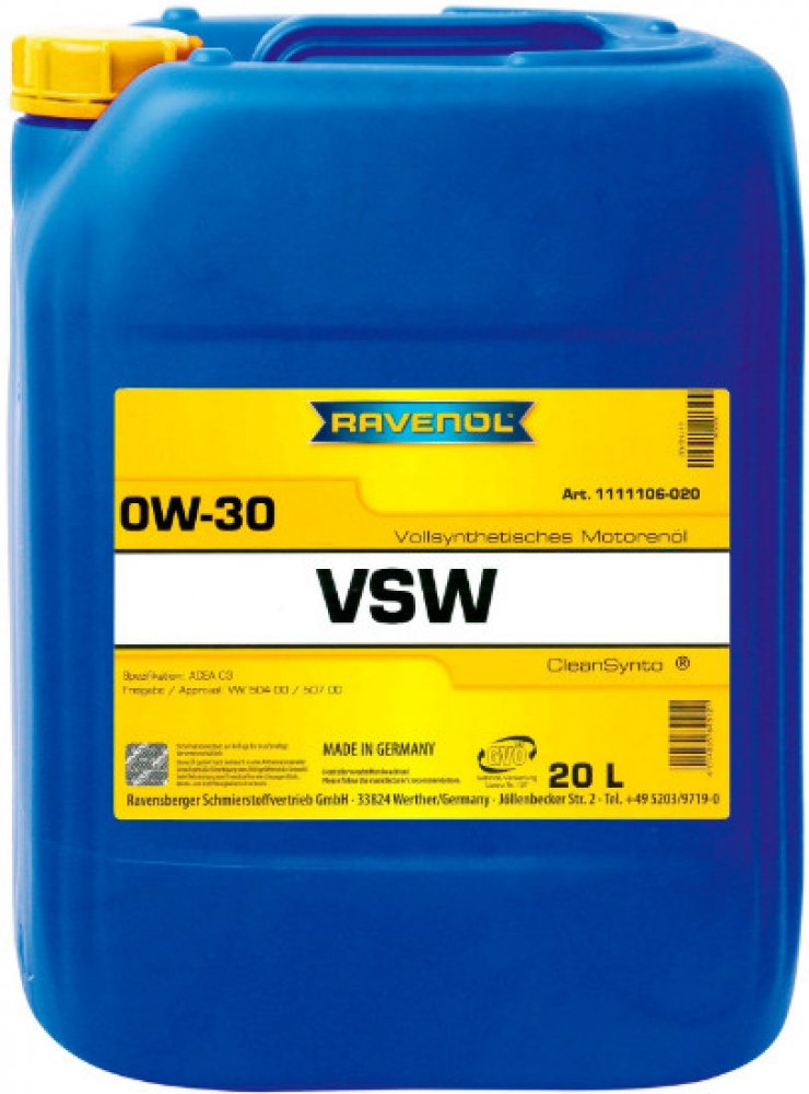 RAVENOL VSW SAE 0W-30 je plně syntetický motorový olej s nízkým třením PAO (Polyalphaolefin), zejména s technologií CleanSynto® pro benzinové a vznětové motory osobních automobilů s turbodmychadlem a přímým vstřikováním.