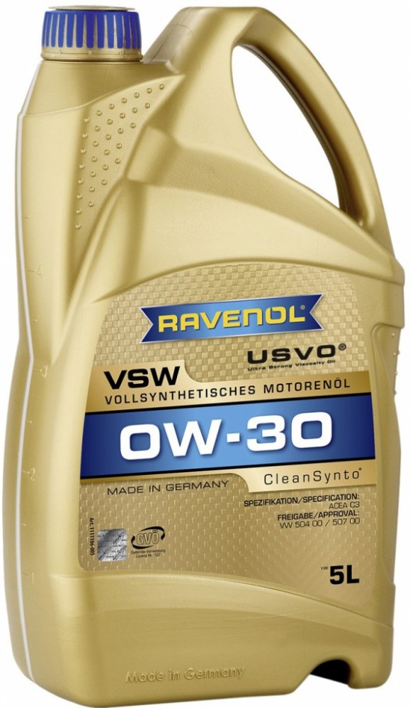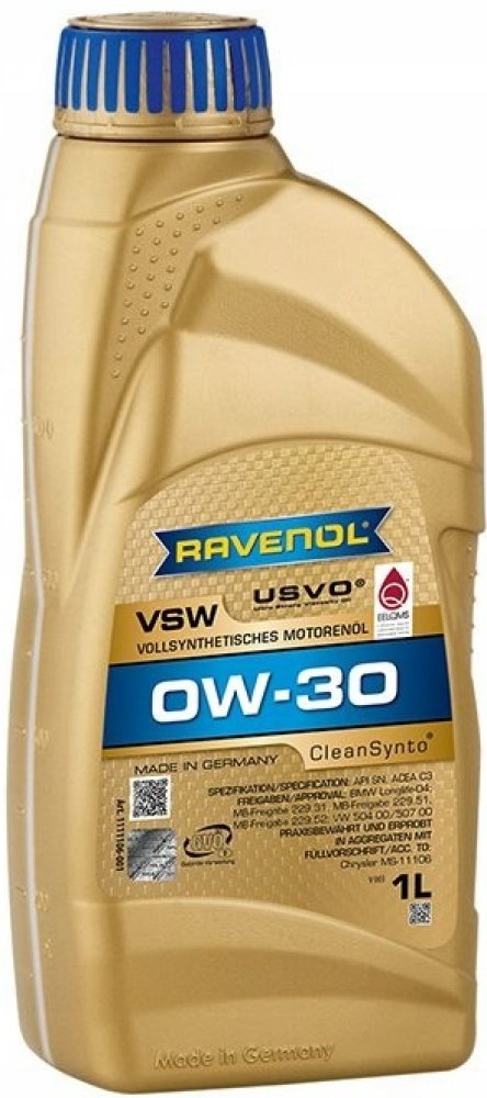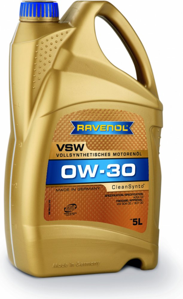 RAVENOL VSW SAE 0W-30 je plně syntetický motorový olej s nízkým třením PAO (Polyalphaolefin), zejména s technologií CleanSynto® pro benzinové a vznětové motory osobních automobilů s turbodmychadlem a přímým vstřikováním.