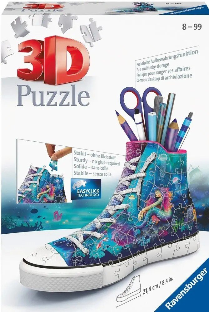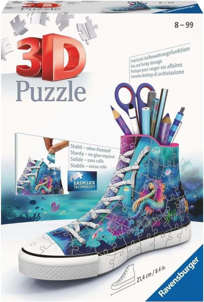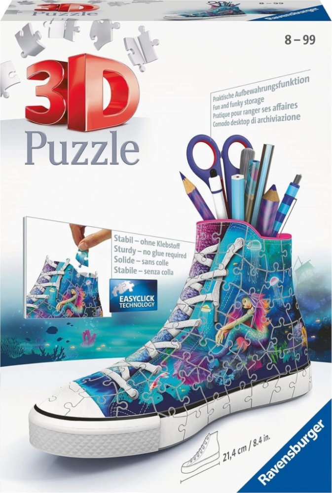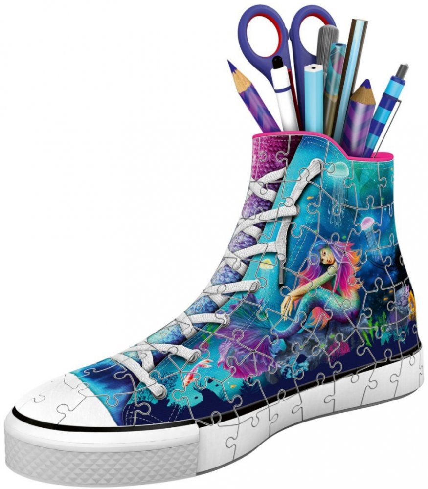 Geniální spojení pro milovníky tenisek a skládání! Poskládejte si 3D puzzle neotřelého tvaru, které oživí Váš stůl ... RAVENSBURGER se pustil do produkce 3D tenisek, které lze použít třeba jako originální tužkovníky pro pera, pastelky nebo třeba štětce. Speciální zakřivené nebo ohebné dílky, které přesně zapadnou na své místo, umožňují postavit designovou tenisku s vesmírným potiskem. Dílky jsou vyrobeny z pevného plastu a zaručí vynikající stabilitu. Kecka drží bez nutnosti lepení. Balení obsahuje 108 očíslovaných dílků puzzle, 4 dílů příslušenství a návod. Upozornění: Dekorace není součástí balení.