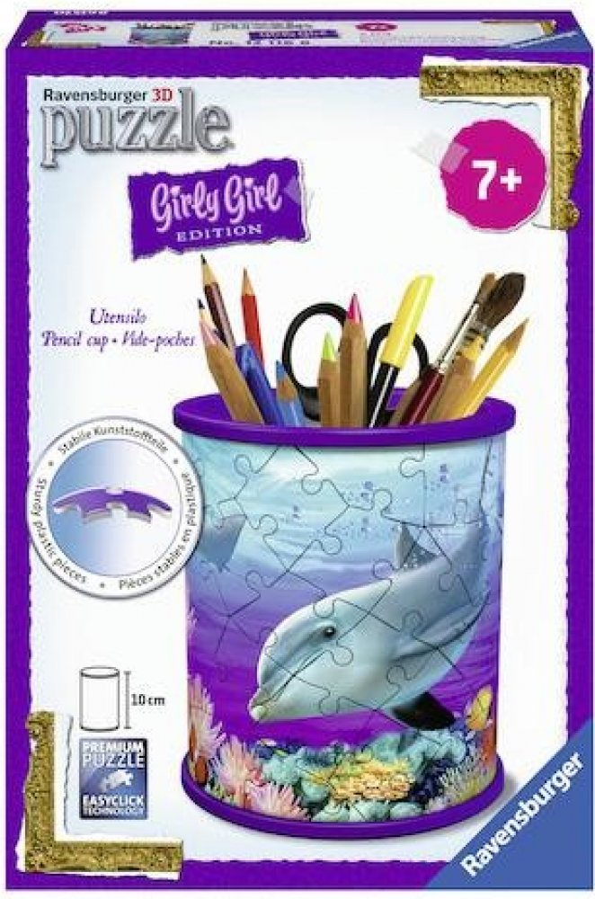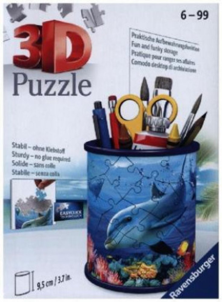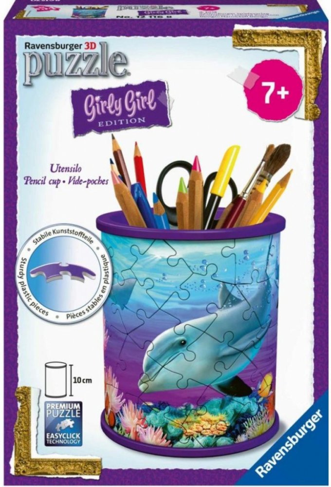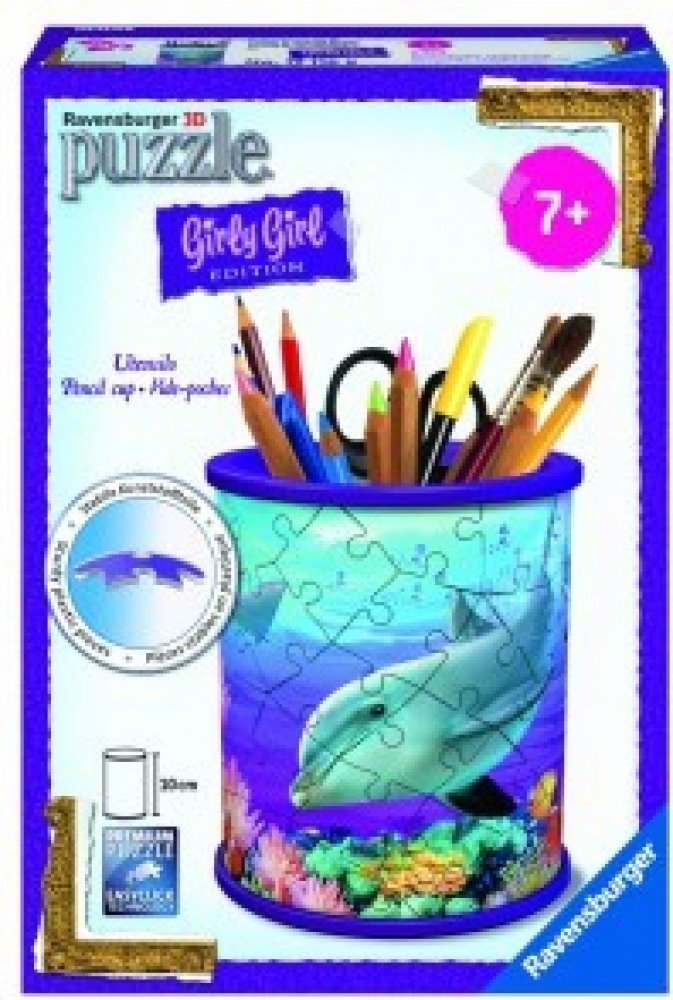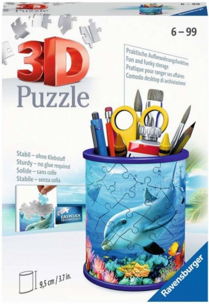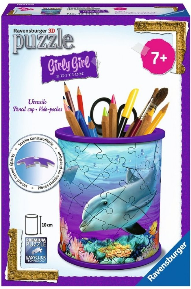 Tužky už se nebudou válet po stole a navíc bude krásný dárek vždycky na očích! Další z řady praktických předmětů ve formě 3D puzzle od výrobce RAVENSBURGER se stane skvělým dárkem pro každou příležitost. A nemusí sloužit pouze jako tužkovník, ale třeba jako stojánek na dekorativní kosmetiku a jiné věci. Speciální zakřivené dílky, které přesně zapadnou na své místo, vytvoří kouzelný stojánek nejen na psací potřeby, ale na cokoliv, co děti potřebují . Dílky jsou vyrobeny z pevného plastu a zaručí vynikající stabilitu bez nutnosti lepení. 3D puzzle RAVENSBURGER lze skládat podle motivu (obtížnější varianta) nebo podle praktického číslování na zadní straně dílků. Stojan má po sestavení výšku přibližně 9,5 cm. Balení obsahuje: