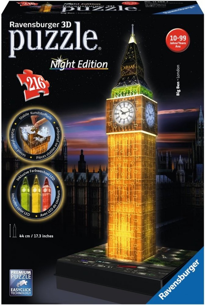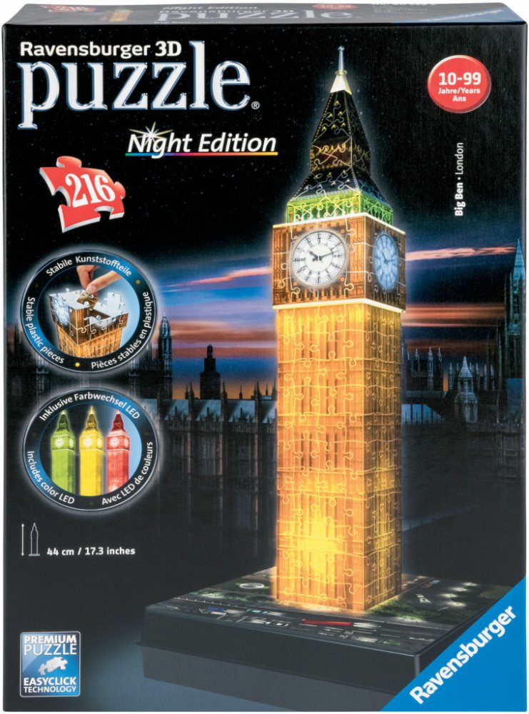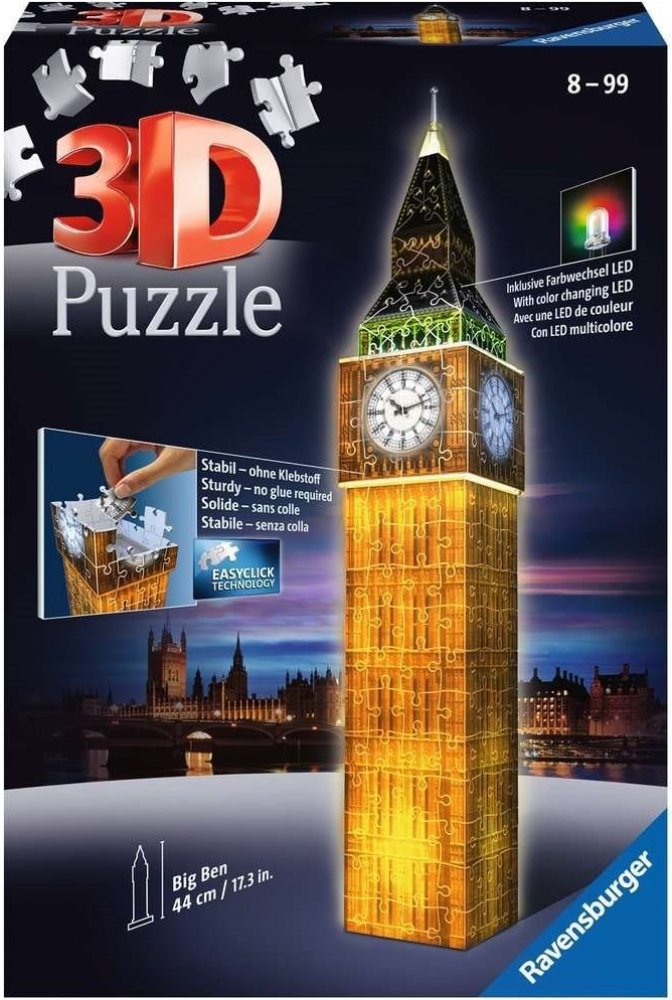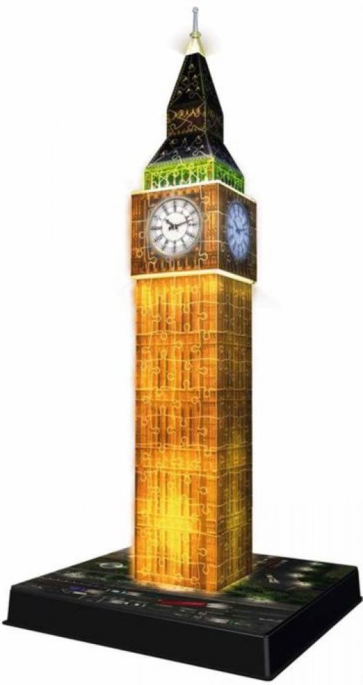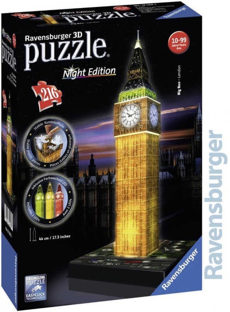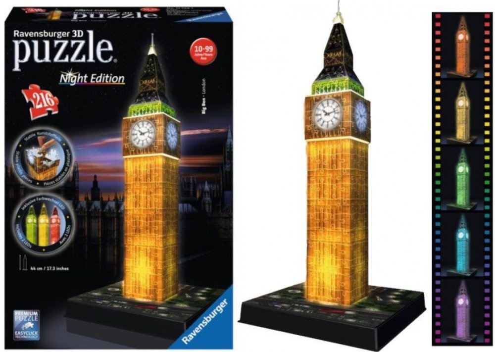 Stavba z výroby německé společnosti RAVENSBURGER se díky LED světlu ve tmě barevně rozzáří. Noční Big Ben je skvělým dárkem i nevšedním kouskem v 3D rozměru.
