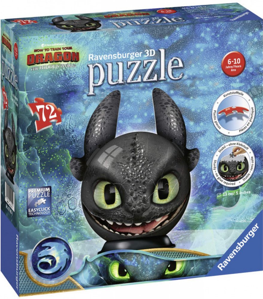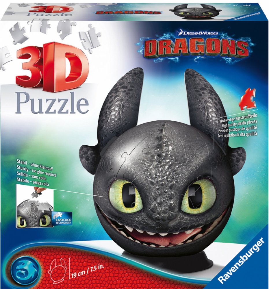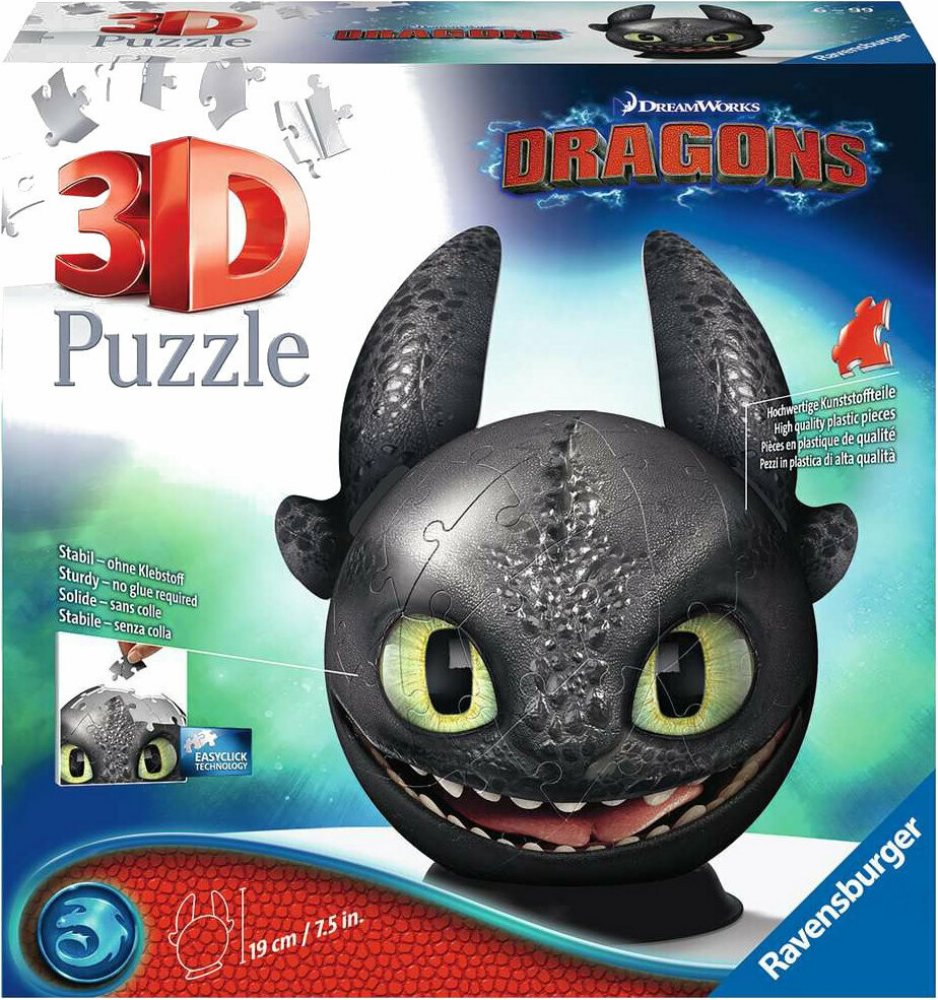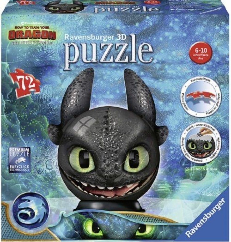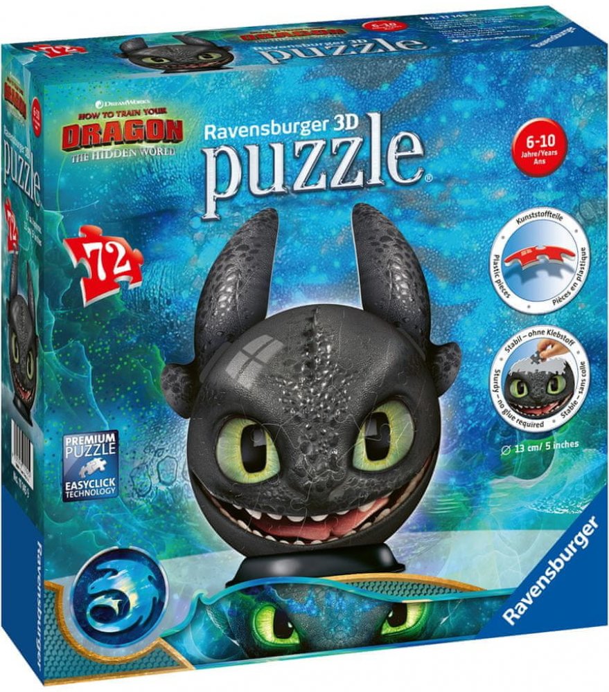 Sestavte si stabilní kouli z vysoce kvalitních plastových dílků puzzle s motivem Jak vycvičit draka, které do sebe přesně zapadají díky klik-technologii bez lepení.