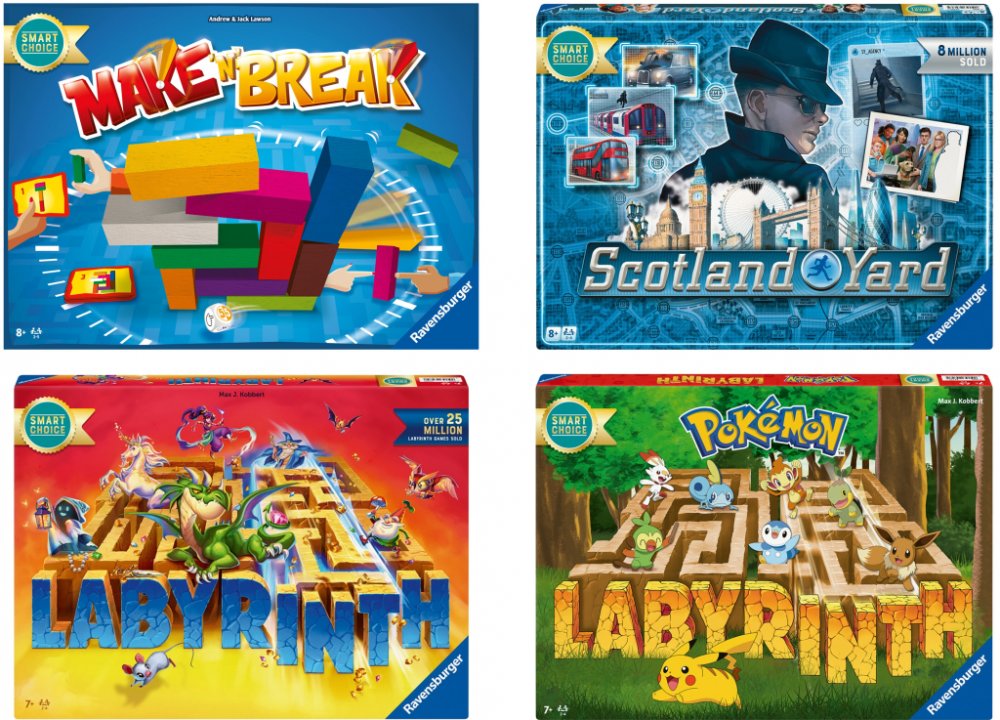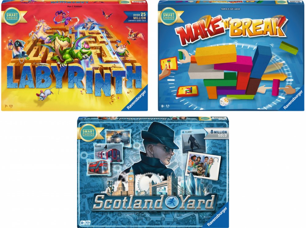 Ravensburger Deskové hry pro celou rodinu Labyrint Desková hra Labyrint v novém obale Jednoduchá a jedinečná herní zábava Hráči se pohybují po labyrintu – hledají tajemné předměty a bytosti Pomocí magie mohou hráči posouvat stěny labyrintu Každá hra je jiná díky náhodnému uspořádání karet chodeb Cíl hry: Najít jako první cestu ven a zároveň odhalit tajemství na kartách Vhodné pro 2–5 hráčů Doporučený věk: od 8 let Doba trvání hry: 20–30 minut Make 'n' Break Výzva pro malé i velké stavitele Hra vyžaduje rychlost a zručnost Hráči se učí pracovat pod tlakem, rozhodovat se rychle a rozvíjet týmové schopnosti Stavění podle zadání na 80 oboustranných kartách Nové úkoly jsou ještě náročnější a obsahují záludné varianty díky speciální hrací kostce Možnost hrát klasickou verzi nebo s novými pravidly Cíl hry: Postavit zadání v časovém limitu Vhodné pro 2–4 hráčů Doporučený věk: od 7 let Doba trvání hry: 20–30 minut Scotland Yard Klasická detektivní hra z 90. let s novým vydáním Scotland Yard honí tajemného zločince Mistra X v ulicích Londýna Detektivové musí spolupracovat na jeho dopadnutí Nové vydání umožňuje hru pro dva hráče Mister X uniká detektivům pomocí různých prostředků – zanechává za sebou pouze jízdní lístky Detektivové vítězí; pokud se nacházejí na stejné stanici jako Mister X Cíl hry: Dopadnout Mistra X dříve; než projede Londýnem do konce hry Vhodné pro 2–4 hráčů Doporučený věk: od 8 let Doba trvání hry: 45–60 minut Hmotnost Labyrint: cca 0,890 kg Make 'n' Break: cca 0,630 kg Scotland Yard: cca 1,21 kg