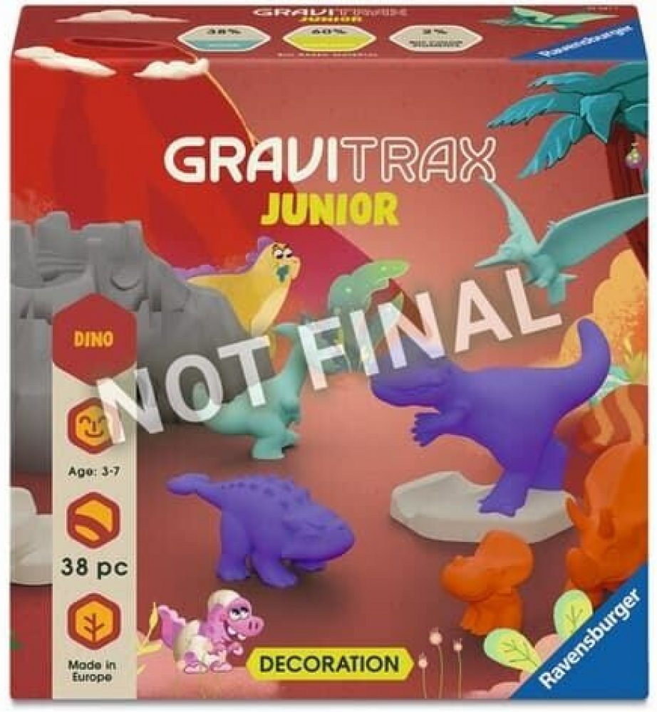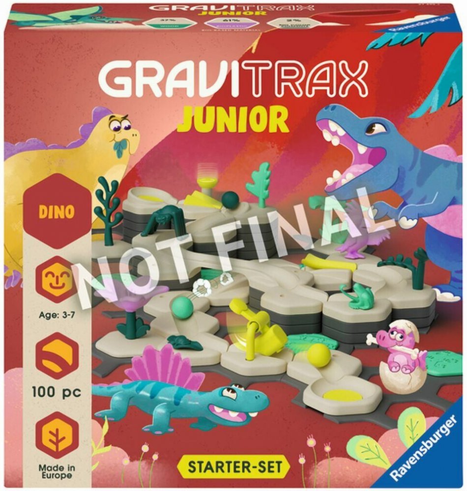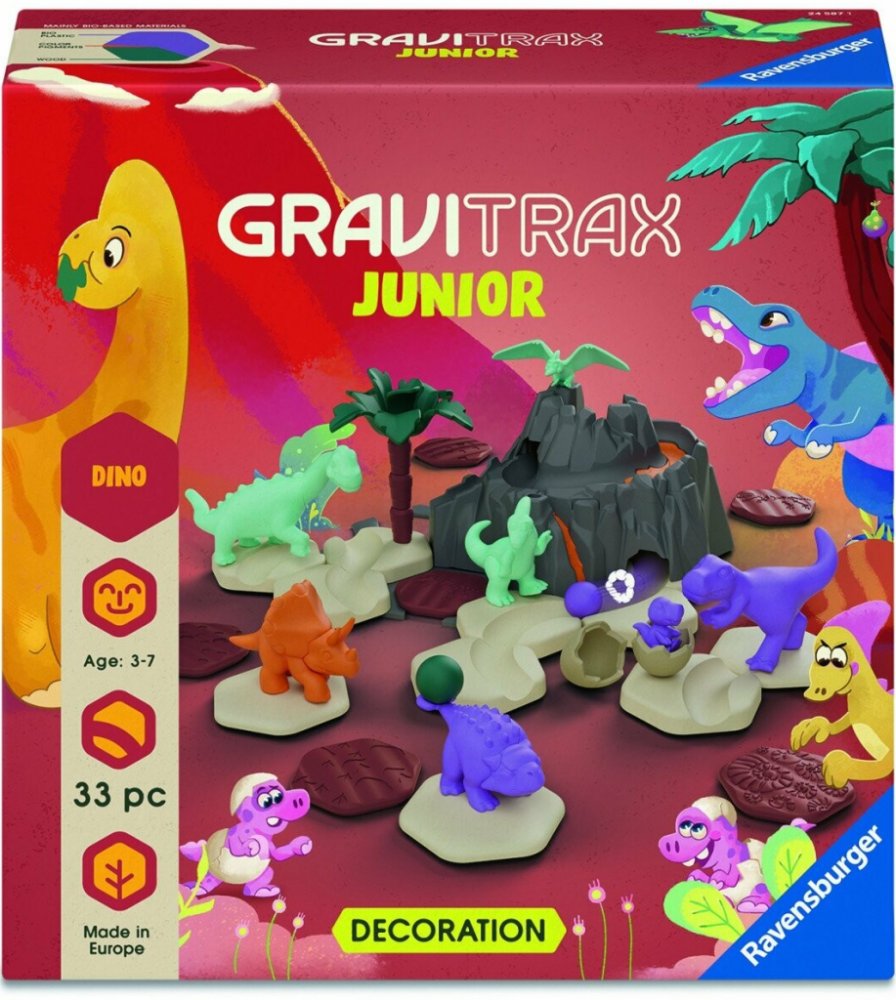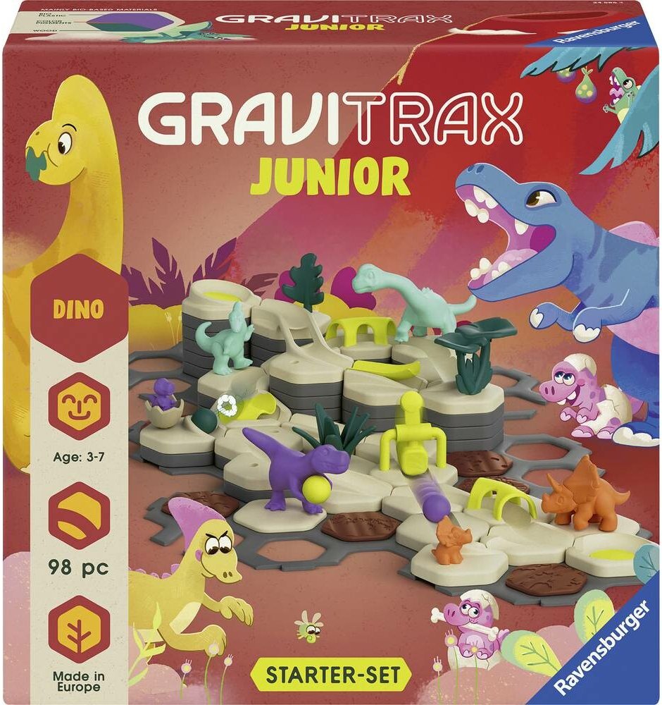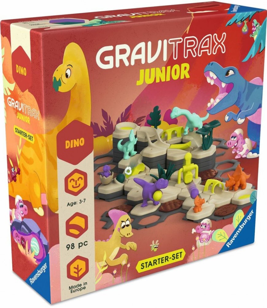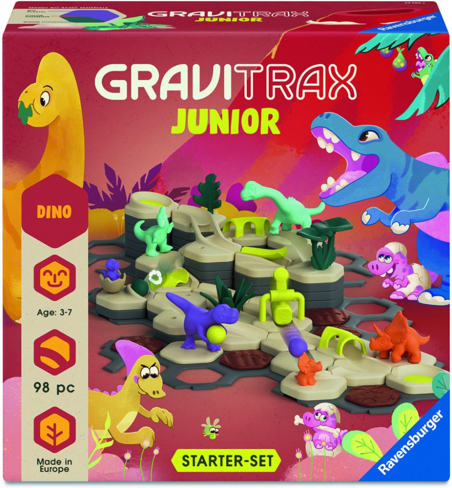 Startovací sada GraviTrax Junior L Dino nabízí dětem od 3 let skvělý vstup do světa tematických kuličkových drah. Díky dinosauřím figurkám, propracovaným prvkům a speciálním dílkům mohou děti vytvářet vlastní pravěký svět. Tunelové zatáčky, výhybky, 3v1 zatáčky a křižovatky přidávají na dynamice i zábavě při stavění. Všechny díly jsou vyrobeny z kvalitního dřevěného bioplastu a sada obsahuje vše potřebné k okamžitému hraní.