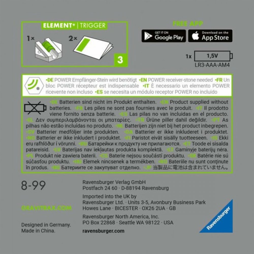 Kompatibilní s ostatními doplňky GraviTrax Power. Lze zapojit do všech stavebních prvků z ostatních řad GraviTrax.