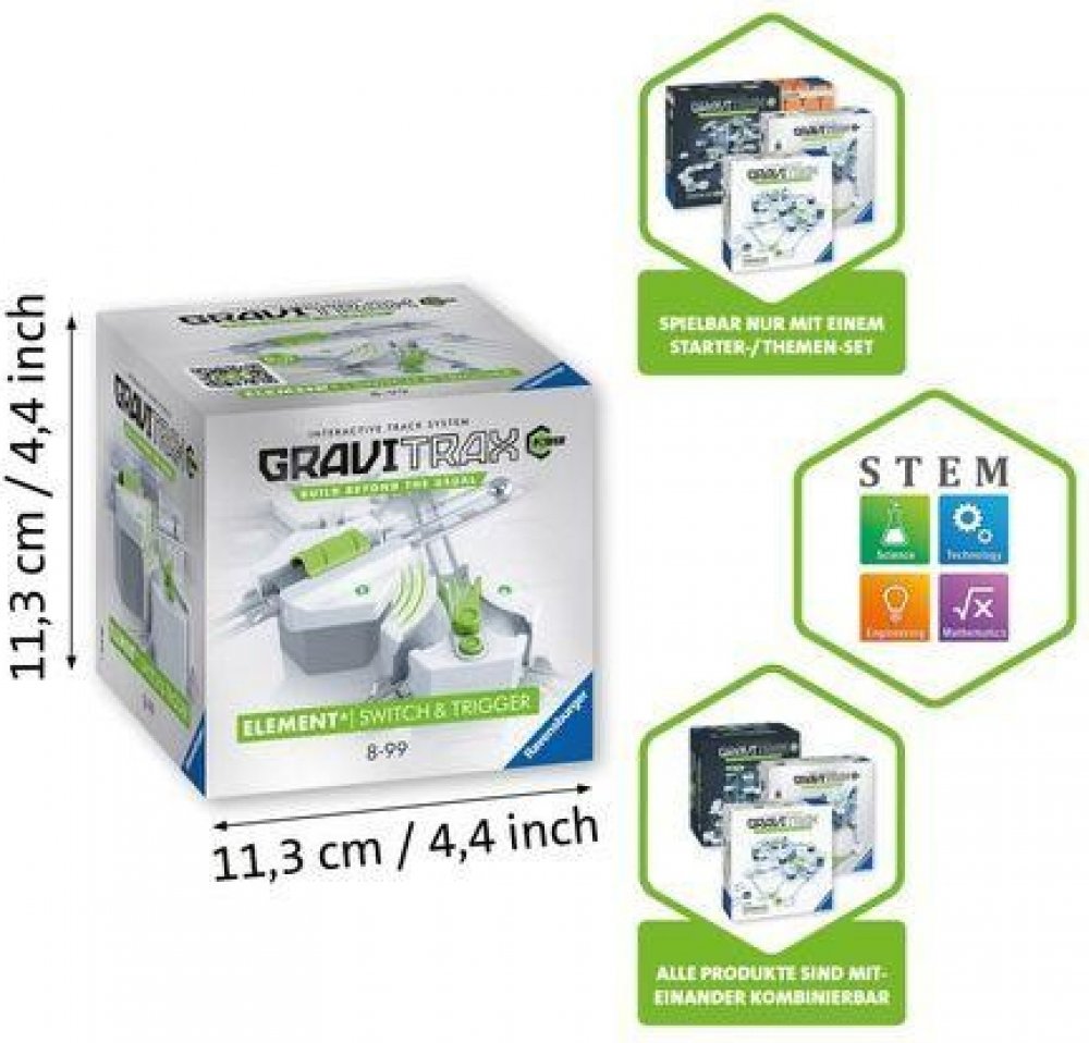 Výhybka a Spoušteč - dvojice vzrušujících GraviTrax Power akčních doplňků v jednom balíčku. Výhybka se automaticky přepne, když kulička projede Spouštěčem. Oba doplňky spolu vzájemně komunikují díky neviditelným spojením. Objevte nové možnosti budování kuličkových drah díky zapojení Výhybky a Spouštěče do vaší dráhy. Oba doplňky lze propojit s dalšími prvky GraviTrax POWER a ostatními řadami Gravi...