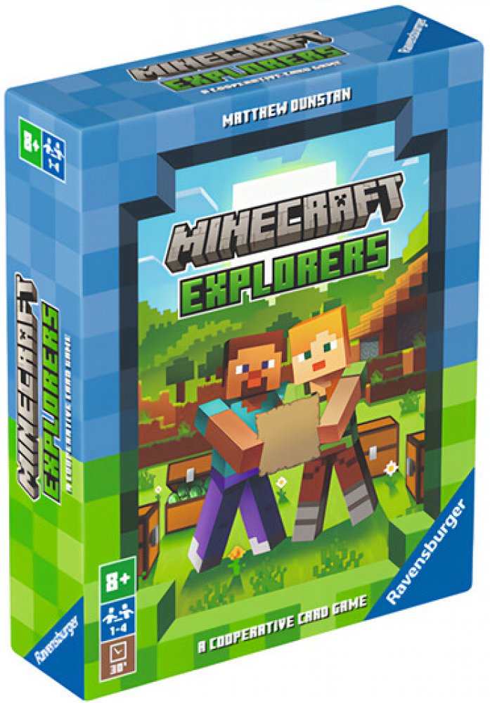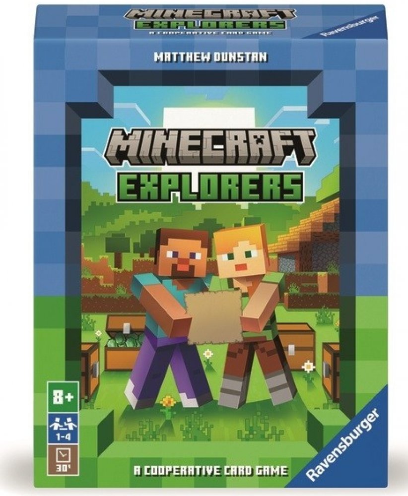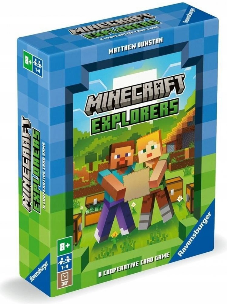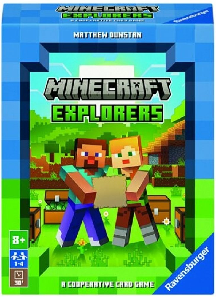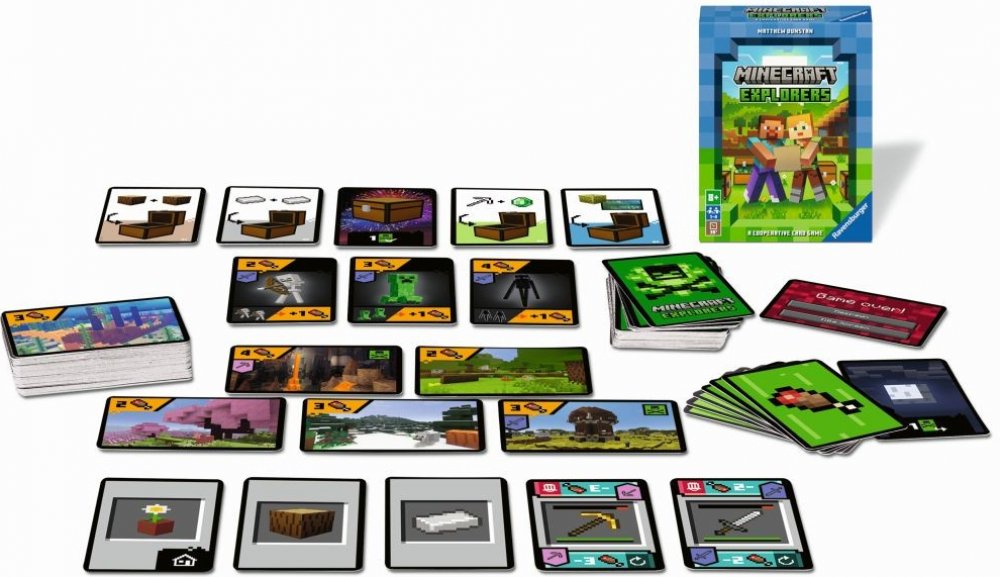 Ve hře Minecraft Explorers vás čeká společné prozkoumávání hranaté krajiny inspirované bloky z ikonické hry a pátrání po ukrytém pokladu. Při každém tahu máte určitý počet akčních bodů, které využijete podle svého uvážení. Použití krumpáčů a mečů může zjednodušit pátrání, takže je dobré je získat. Cílem Minecraft Explorers je najít poklad a vyhrát. Vyhýbejte se nepřátelům, jako jsou zombie, Creeperové a Endermani, protože na konci každého kola musíte odhalit kartu nepřátel, a pokud už jsou v hře, může to situaci zkomplikovat. Pokud dojdou karty s monstry, hra končí. Truhly s poklady proto musíte naplnit dřív, než se to stane. Obsah hry Minecraft Explorers: 110 hracích karet a pravidla hry