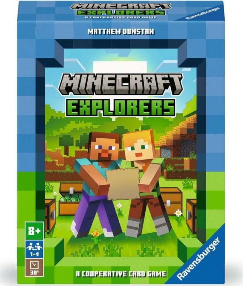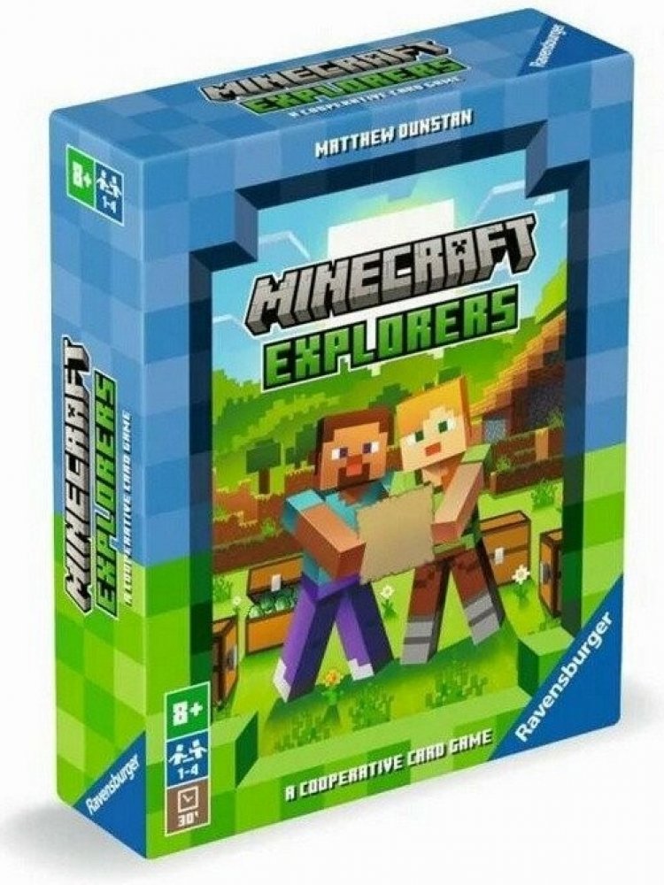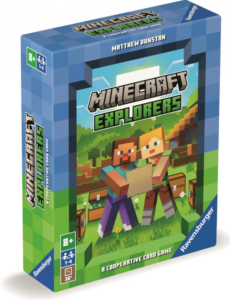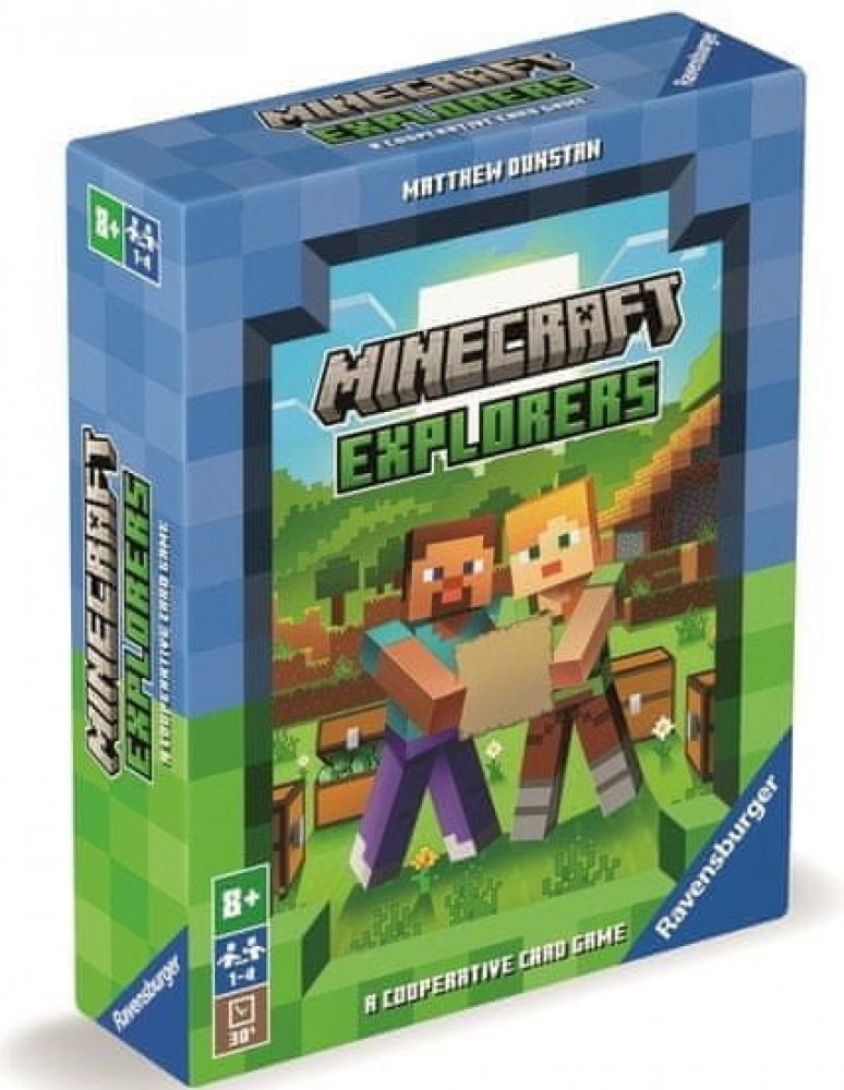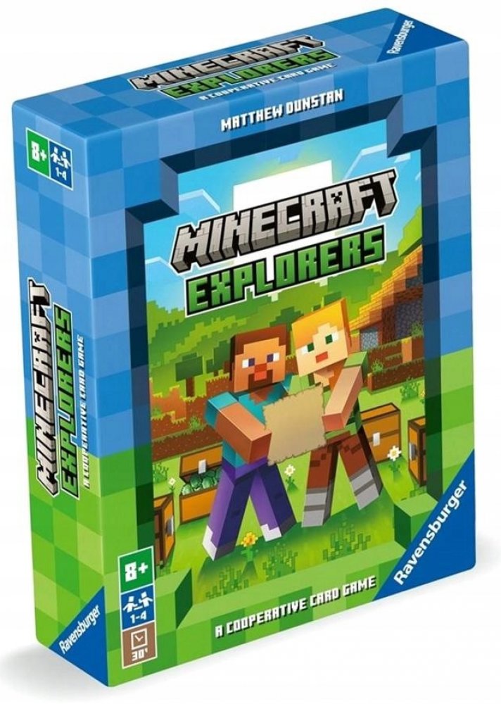 Ve hře Minecraft Explorers vás čeká společné prozkoumávání hranaté krajiny inspirované bloky z ikonické hry a pátrání po ukrytém pokladu. Při každém tahu máte určitý počet akčních bodů, které využijete podle svého uvážení. Použití krumpáčů a mečů může zjednodušit pátrání, takže je dobré je získat. Cílem Minecraft Explorers je najít poklad a vyhrát. Vyhýbejte se nepřátelům, jako jsou zombie, Creeperové a Endermani, protože na konci každého kola musíte odhalit kartu nepřátel, a pokud už jsou v hře, může to situaci zkomplikovat. Pokud dojdou karty s monstry, hra končí. Truhly s poklady proto musíte naplnit dřív, než se to stane. Obsah hry Minecraft Explorers: 110 hracích karet a pravidla hry