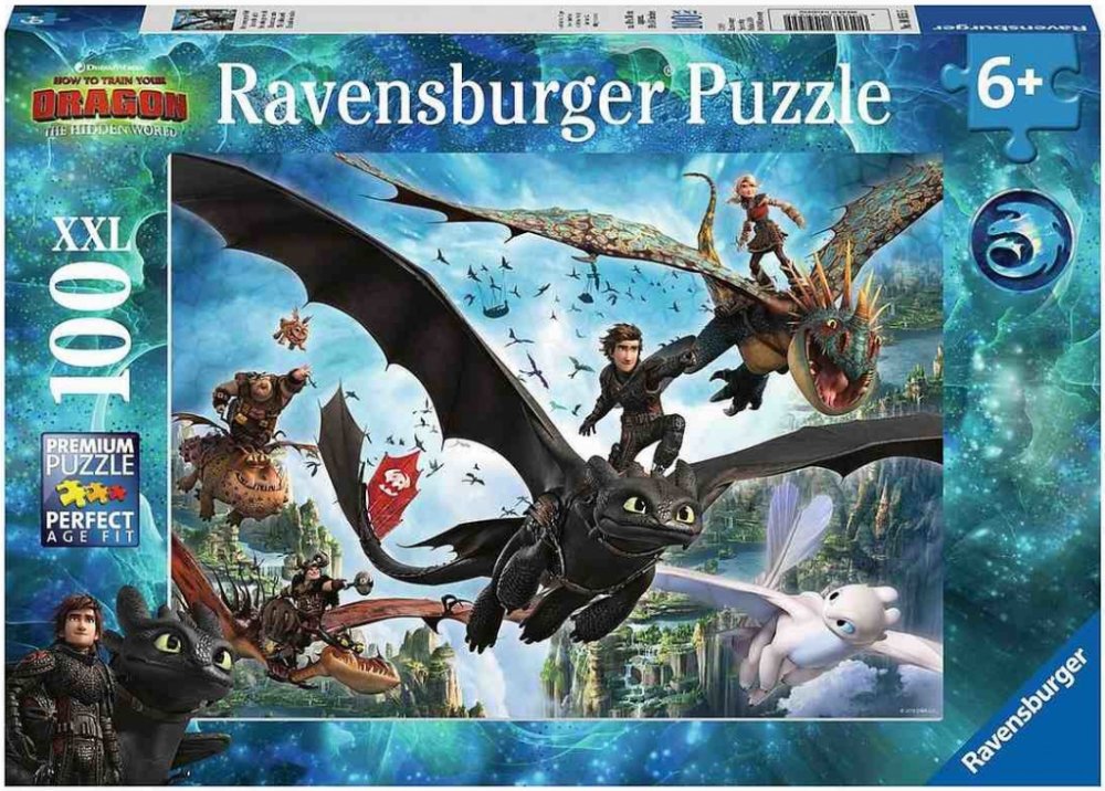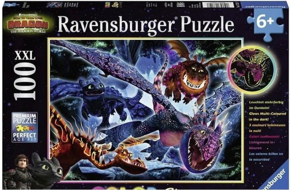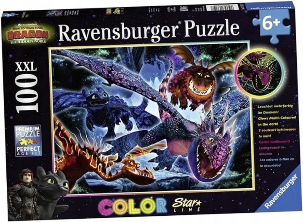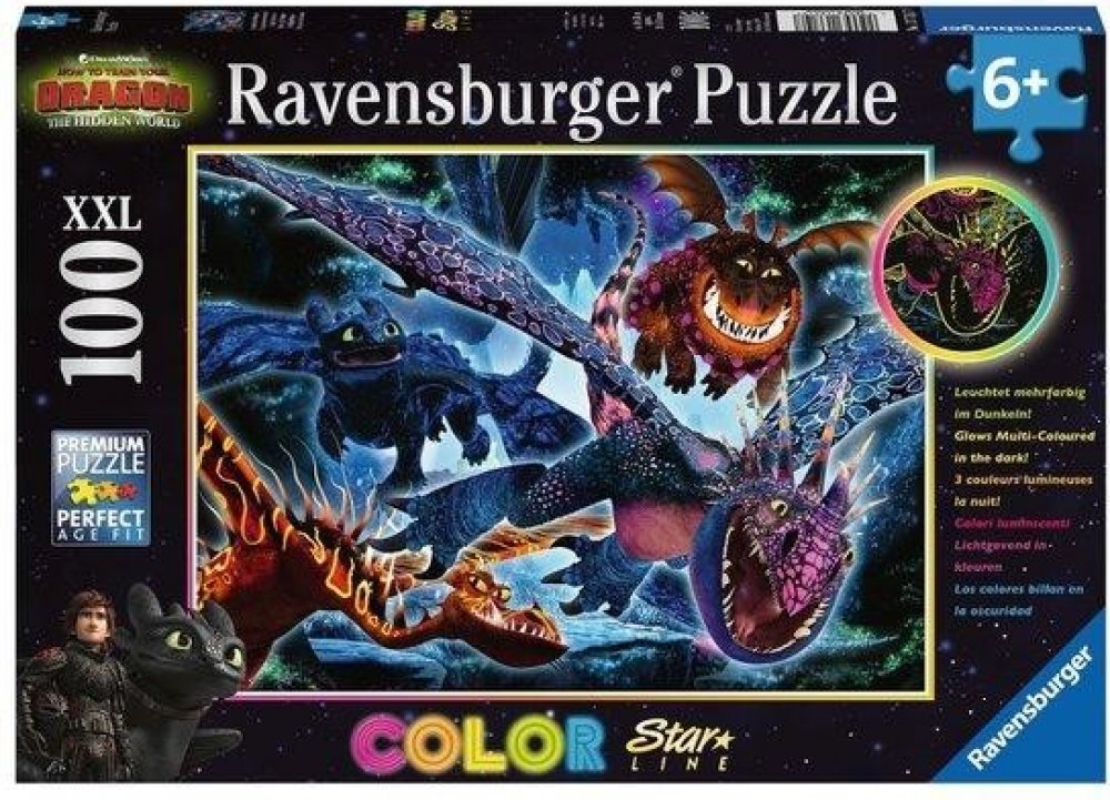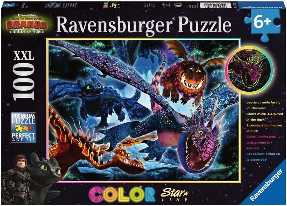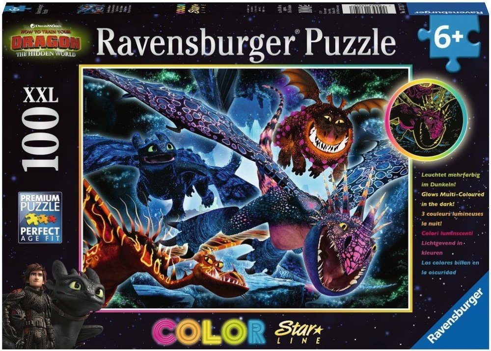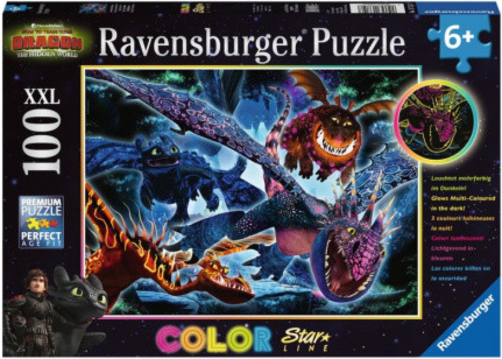 Zhasněte světla, zapněte puzzle! To je možné s jedinečnými puzzle Ravensburger Color Star Line, které svítí několika barvami najednou. Poslední dílek skládačky byl umístěn, radost je veliká. A nadšení roste, protože nyní přichází vrchol této novinky: podržte puzzle proti světlu, zatemněte místnost a WOW! Rozsvítí se červeně, modře a žlutě! Díky dalším svítícím barvám na povrchu motiv září v několika barvách. Se 100 dílky ve formátu XXL jsou vhodné pro děti od 6 let. Svítící puzzle Color Star Line, upevněné pomocí lepicích listů Ravensburger, lze snadno zavěsit a provázet malé hlavolamisty noc co noc do říše snů. Barevné motivy byly speciálně vyvinuty pro pestrobarevné světelné efekty. Výběr správných motivů a vysoká kvalita našich dětských puzzle jsou pro nás velmi důležité. Poznámka: Pro dosažení plné svítivosti posviťte na puzzle jasným zdrojem světla po dobu jedné minuty. Maximální svítící efekt trvá několik minut a poté pomalu slábne, přičemž každá z barev svítí různě dlouho. Puzzle pro děti s velkými dílky s oblíbenými vikingy a jejich mazlíčky z animovaného seriálu Jak vycvičit draka 3. Neonové - fluorescenční puzzle se speciálním potiskem ze série COLOR STAR LINE, které po nasvícení trojbarevně svítí. Doporučeno pro děti od 6 let. Jak vycvičit draka XXL Puzzle 100ks