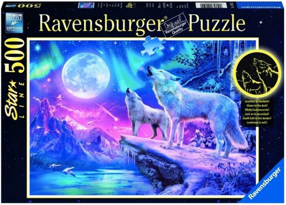 Neonové - fluorescenční puzzle značky Ravensburger svítící jednobarevně ve tmě ze série STAR LINE. Puzzle má speciální potisk, který po nasvícení ve tmě svítí. Krásné puzzle s motivem vlků vyjících na měsíc.