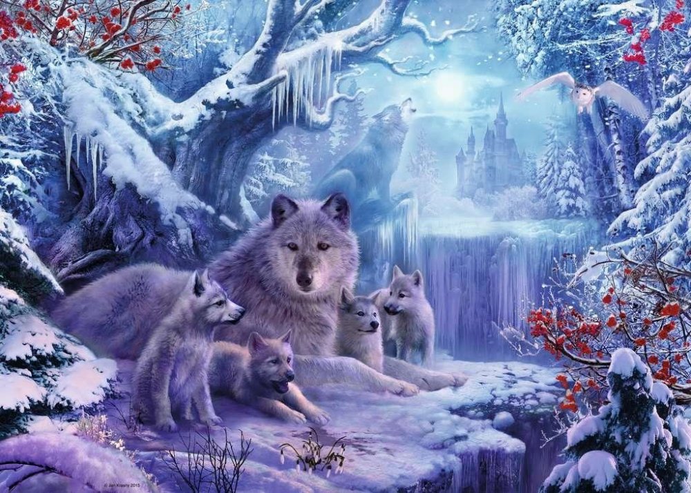 Vysoce kvalitní puzzle Ravensburger s motivem severního kraje s vlky.