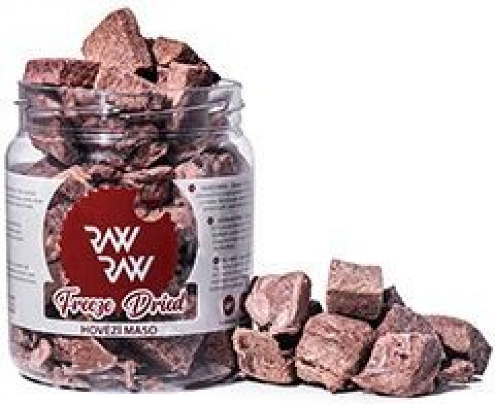 Mrazem sušené pamlsky Raw Raw jsou nejlepší, nejchutnější a nejzdravější pamlsky, které můžete svým mazlíčkům nabídnout. Masové pamlsky Raw Raw jsou vyrobeny ze syrového masa sušením mrazem (lyofilizací). Tato metoda zpracování zachovává kvalitu masa v raw stavu (odpovídající syrové stravě), vysoký obsah bílkovin, chuť i aroma a nutriční hodnoty. Pamlsky jsou zcela bez glycerinu, konzervantů, barviv, ochucovadel a jakýchkoliv plnidel či náhražek. Prostě jen čisté maso!Raw Raw pamlsky nabízí kromě nejčistší technologie zpracování a nejefektivmějšího způsobu uchování kvality syrového masa také maximální komfort pro všechny vaše aktivity. I když mají pamlsky kvalitu syrového masa, můžete je vzít kamkoliv a kdykoliv, na rozdíl od syrového masa se vám od nich nic neumaže, nekazí se po otevření ani v horku, nepotřebují uchování v lednici a velmi dobře se podávají, protože jsou křehké.Pamlsky Raw Raw vynikají mnoha přednostmi:- Freeze Dried - sušeno mrazem- Glycerin Free - zcela bez glycerinu- BARF - vhodné pro barf- 100% Natural - absolutně přírodní- Grain Free - zcela bez obilovin- vysoká nutriční hodnota- vynikající chuť masa téměř identická s čerstvým- vhodné pro monoprotein výživu a alergiky- vhodné pro všechna plemena psů, štěňata i kočky- skvělá konzistence pamlsků, které se dobře podávají a velmi dobře konzumují- praktická šroubovací krabičkaHovězí maso má vysokou nutriční hodnotu, proto je skvělé pro zvýšení poměru bílkovin v krmné dávce pro psy s vysokými nároky na výživu - psí sportovce, pracanty a pro psy ve vývinu nebo podvyživené psy. Hovězí svalovina podporuje budování svalové hmoty a je tak ideální pro štěňata a mladé psy nebo psy s vysokou zátěží či potřebou nabrat svaly. Hovězí bílkovina je vhodná pro většinu alergiků.Složení: 100% hovězí maso (libová svalovina).Analytické složky: Hrubý protein 66,8%, hrubý tuk 30,1%, hrubá vláknina 0,5%, hrubé popeloviny 3,4%, vlhkost 1,3%.Velikost pamlsků: kostičky o velikosti cca 1cm - 4cm (přirozený tvar krájené suroviny - masa nebo vnitřností)Freeze Dried - sušeno mrazemLyofilizace, neboli sušení mrazem, je nejvyspělejší technologie zpracování potravin.Její předností je uchování maximální hodnoty potravin - obsahu vitamínů, bílkovin a dalších nutričních látek a to bez jakýchkoliv konzervantů. Principem technologie je mražení potravin ve vakuu při teplotě mínus 40°C, která vede k sublimaci vody.Potraviny si tak zachovávají výživové hodnoty, svou chuť, vůni a vzhled.Glycerin Free - bez glycerinuGlycerin je běžně obsažen ve vysokém množství v tzv. sušených masových pamlscích, kde působí jako konzervant, změkčovadlo a dochucovadlo. Jako součást potravin má označení E 422. Glycerol neboli glycerin je slabě jedovatý. V menších dávkách způsobuje bolesti hlavy, žaludeční potíže a zvracení. Ve větších dávkách může způsobit poškození jater. Nejnižší toxická dávka podaná orálně u člověka činí přibližně 1,5 g/kg živé hmotnosti. V medicíně se používá jako součást klystýrů a čípků. (zdroj info Wikipedie)Sledujte obsah glycerinu v pamlscích a pamlskům s vysokým obsahem glycerinu se vyhýbejte!B.A.R.F. - vhodné pro barfPokud svého psa nebo kočku krmíte syrovou stravou - barfem, jistě nechcete tento přístup k výživě narušit nevhodnými pamlsky. Raw Raw pamlsky jsou pro vás ideální volbou.100% Natural - zcela přírodníPamlsky Raw Raw jsou zcela přírodní, bez jakýchkoliv konzervantů, barviv a dochucovadel. To je možné díky technologii lyofylizace - sušení mrazem. Freeze dried pamlsky patří k nejčistším a nejpřírodnějším pamlskům na trhu vůbec.Grain Free - bez obilovinPokud své mazlíčky krmíte bezobilným krmením, barfujete nebo máte alergika na lepek, oceníte, že pamlsky Raw Raw neobsahují žádné obiloviny a nejsou ničím "nastavovány". Jsou z čerstvé suroviny (svalovina, vnitřnosti) bez rýže, mouky, ať už jakéhokoliv původu (kukuřičná, pšeničná, rýžová), bez škrobu, lepku... Obiloviny zatěžují trávicí trakt lepkem a prázdnými kaloriemi. Podáváním psích piškotů, sucharů, sušenek nebo lisovaných kostiček z kukuřičné moučky svým mazlíčkům dáváte spoustu prázdných kalorií.Upozornění:Není určeno pro lidskou spotřebu.Skladujte v suchu a chladu.Nevystavujte přímému slunečnímu záření.Po otevření uchovávejte v suchu.Použití:Pamlsek pro psy a kočky. Zvíře musí mít přístup k čerstvé vodě.