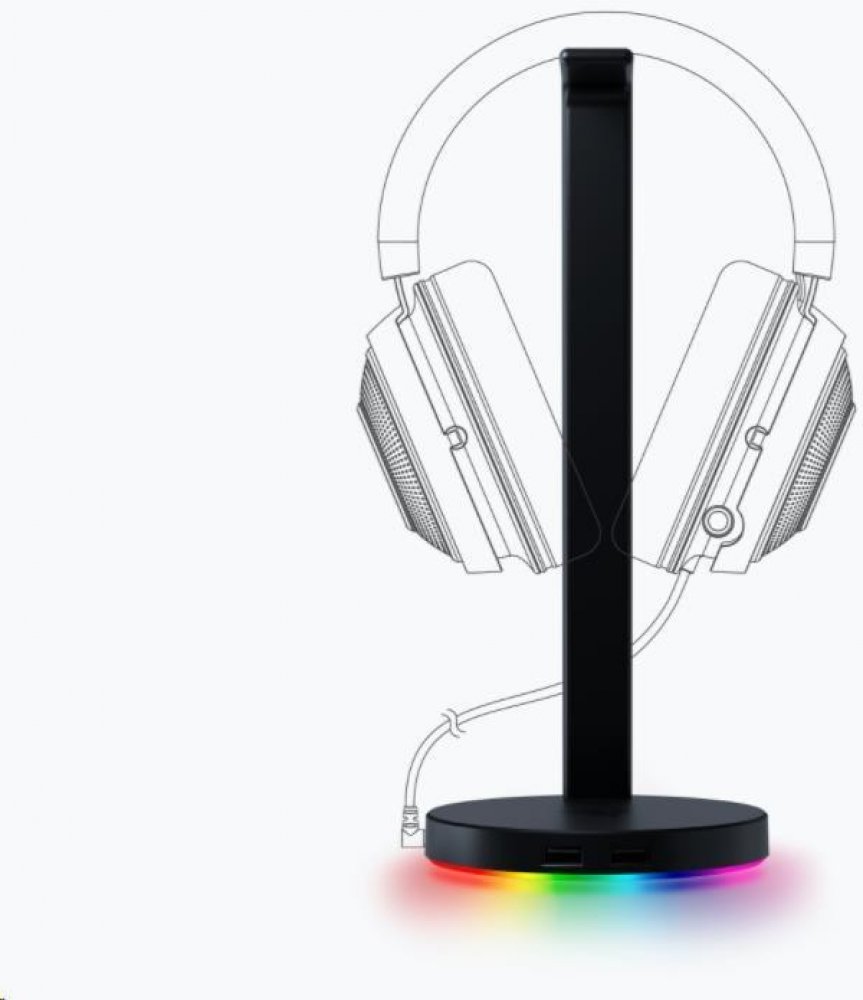 2 x USB 3.1 porty · 1 x 3,5 mm kombinovaný port s integrovaným DAC · 7.1 prostorový zvuk · Razer Chroma RGB · Zcela nová hliníková konstrukce · Vylepšená výška pro větší sluchátka · Protiskluzová základna