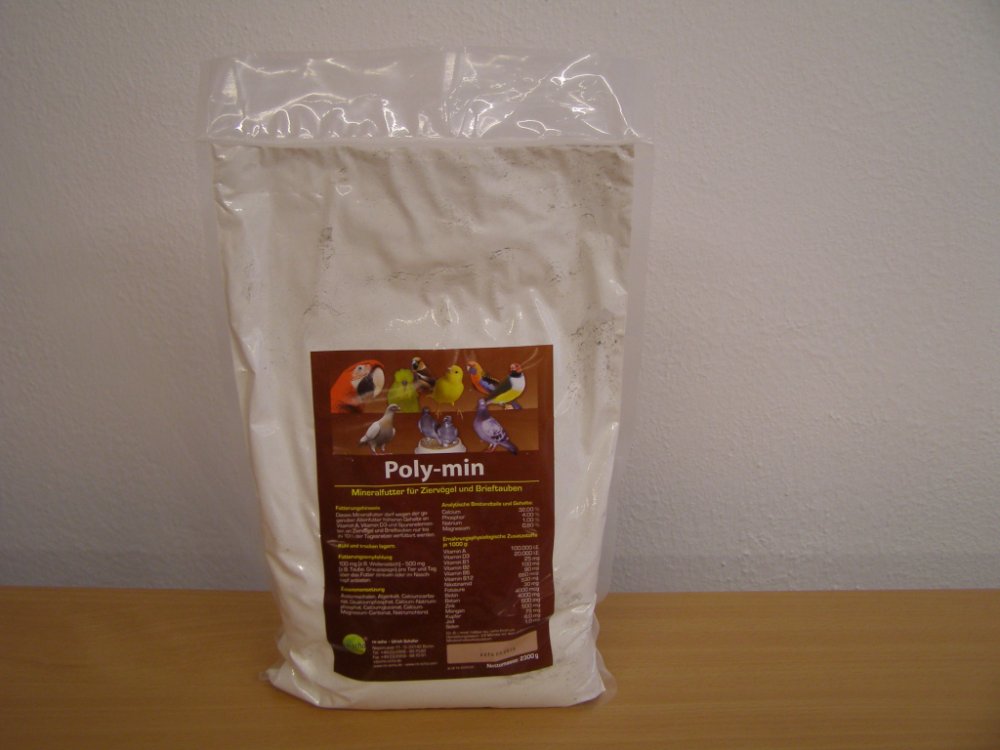 Poly-min obsahuje minerály, které jsou třeba pro běžný metabolismus (látková přeměna v živém organismu) ptáků. Poly-min jsou vysoce kvalitní jemné, namleté fosilní mušle. Narozdíl od vápencových mušlí, tyto mají prodloužné uvolňování vápníku. To umožňuje konstantní (stálý) přísun vápníku do těla. Testy prokázaly, že právě postupné uvolňování vápníku má velmi positivní vliv na zdraví zvířat.