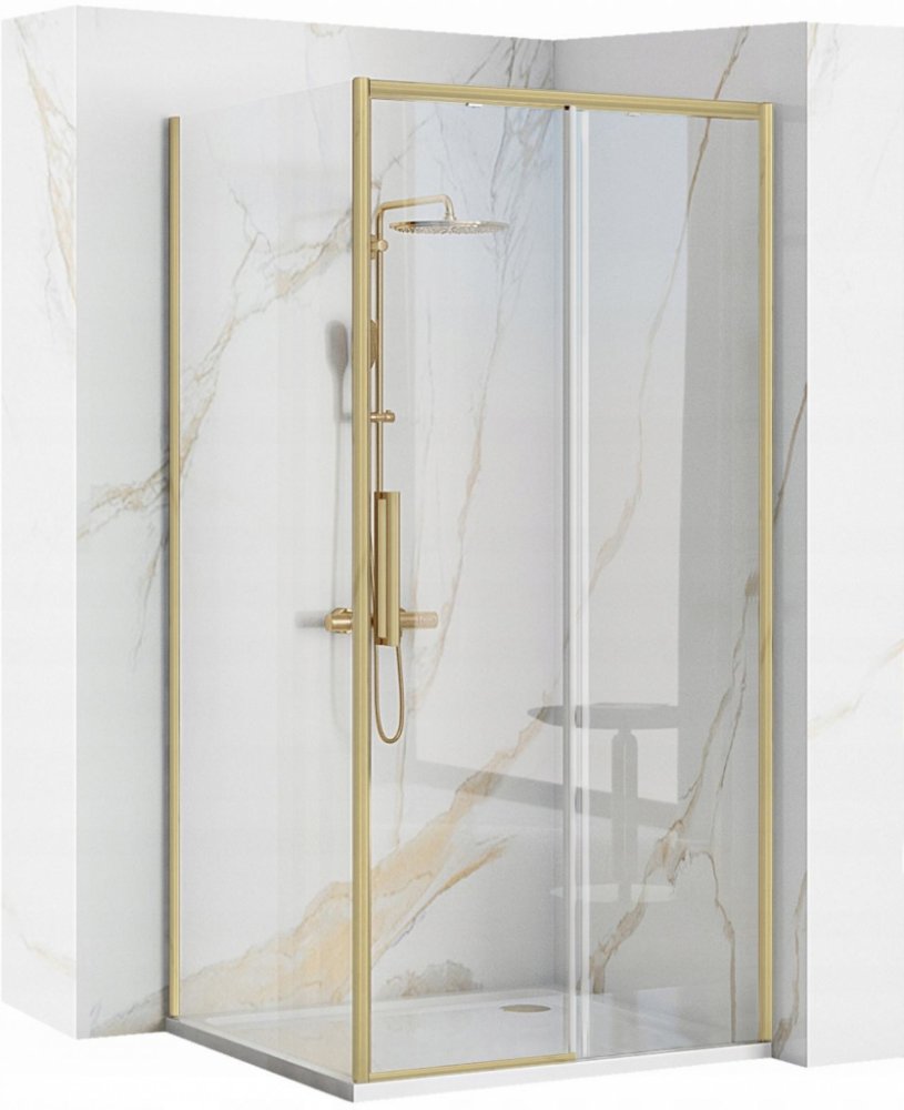 Sprchový kout Rea RAPID slide 100x80 cm - zlatý broušený Sprchový kout RAPID slide je vyroben z 6 mm tlustého tvrzeného bezpečnostního skla. Otevírání dveří je velmi snadné díky kovovému zlatému broušenému madlu a kolejnicovému systému dveří. Aplikovaná technologie Easy Clean zajišťuje jednoduchou údržbu skla. Sestavení koutu je universální na obě strany. Levou či pravou orientaci koutu si zvolíte při montáži. Také si můžete vybrat mezi montáží koutu na sprchovou vaničku nebo přímo na podlahu. Stěny koutu jsou uchyceny ve zlatých broušených hliníkových profilech a jsou vybaveny magnetickým uzavíráním a spodním těsněním. Díky regulaci v profilech lze vyrovnat mírné nerovnosti stěn. Podlahová lišta o výšce 10 mm zamezí vytékání vody pod dveřmi. Vanička, sprcha ani odtokový žlab nejsou součástí sprchové koutu. Dokoupit je můžete u nás v eshopu. Parametry: rozměr: 100x80 cm - nastavitelné v šíři 990-1010 (dveře) 785 x 795 mm (pevná stěna) sklo: čiré profily: hliníkové, zlaté kartáčované, 33x25 mm madlo: kovové, zlaté kartáčované otevírání: posuvné, kolečková kolejnice montáž: na sprchovou vaničku nebo přímo na zem součástí balení je kompletní sprchový kout včetně těsnění, podlahové lišty a montážního materiálu (bez vaničky, sprchové soupravy, ... )