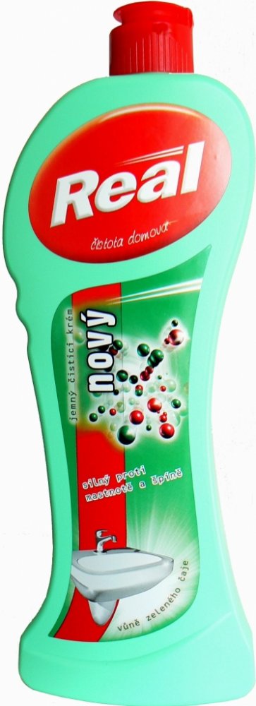 Real nový jemný čisticí krém s vůní zeleného čaje jednoduše a lehce vyčistí i silnou špínu. Díky aktivním abrazivním částicím je tekutý čisticí krém vhodný na čištění nádobí, sporáků, umyvadel, van, WC mís, obkladaček, smaltovaných předmětů a všech nenasákavých povrchů. Aktivní částice usnadní odstranění nečistot. Real navíc vaši domácnost provoní příjemnou vůní zeleného čaje.