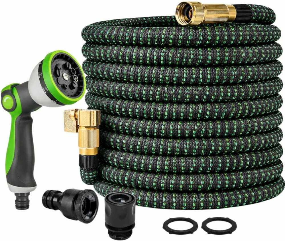 Pracovní délka: 10–30 m Průměr hadice: 6 × 9,5 mm Vnitřní trubice: latex Vnější potah: textilní oplet 3300D (černá + zelená), výplet ve tvaru tykve Konektory: měděné, s ventilem Stříkací pistole: 10 režimů rozprašování Připojení: adaptér 3/4" → 1/2" + rychlospojka Příslušenství: 2 náhradní těsnění