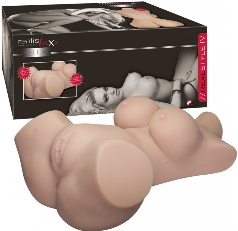 Realistixxx Real Style IV je absolutně realistický masturbátor ve tvaru torza, který vám umožní vychutnat si dvě pozice – misionářskou nebo doggy style. Tento masturbační pomocník je vybaven dvěma těsnými, stretchovými potěšujícími kanály, jeden imituje vagínu a druhý anál, a oba jsou vzrušivě texturovány stimulujícími tečkami pro intenzivní a reálný zážitek. Materiál Natureskin vypadá jako skutečná kůže, je měkký a hedvábný na dotek, což zaručuje realistický pocit při každém vašem tahu. Torzo váží přes 4 kg, což zajišťuje stabilitu na jakémkoliv hladkém povrchu, a můžete ho dokonce používat zcela bez pomoci rukou. Oba otvory jsou těsné a pružné, což zaručuje těsný a přiléhavý zážitek. Vyrábí se z TPE materiálu, který je bezpečný pro tělo a snadno čistitelný.
