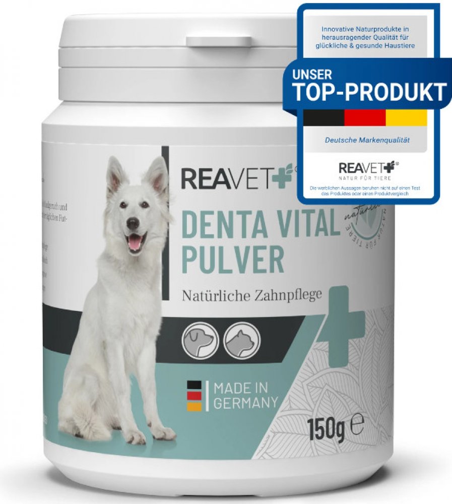 Dopřejte svému mazlíčkovi zářivý úsměv a svěží dech – přirozeně a bez stresu! REAVET Denta Vital v podobě prášku do krmiva zajišťuje každodenní péči o zuby a dásně. Jeho účinné přírodní složení pomáhá snižovat tvorbu zubního kamene a plaku, zatímco máta peprná a petržel dodávají svěží dech a přirozeně bojují proti zápachu z úst.