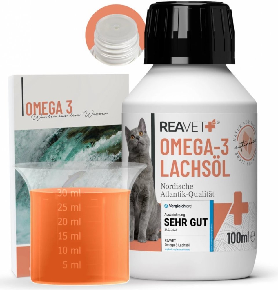 Lososový olej REAVET je vysoce kvalitní 100% přírodní olej, šetrně vyrobený a zvláště bohatý na omega-3 mastné kyseliny. Vyznačuje se velmi jemnou chutí a vůní, vysokou přijatelností a optimální stravitelností. Je to talent nejen na podporu mimořádně hedvábného lesku srsti vašeho čtyřnohého přítele, ale také na podporu zdravé kůže. Lososový olej je obohacením misky vaší kočky, protože optimalizuje denní stravu se všemi potřebnými mastnými kyselinami. Ať už jde o syrové krmení, vařená jídla nebo jako doplněk k suchému nebo mokrému krmivu – náš lososový olej REAVET Omega-3 zvyšuje denní zásobu vaší "sametové tlapky".